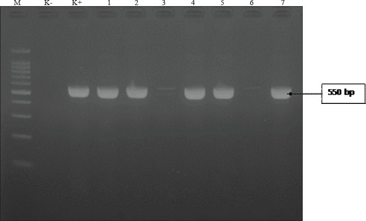 Fig. 4. PCR amplification of the CTX-M gene from E. coli isolates obtained from duck cloacal swabs in traditional markets in Surabaya, Indonesia. Lane M: 100 bp DNA ladder; Lane K+: positive control; Lane K: negative control (PCR-grade water); Lanes 1–7: representative isolates tested. PCR, polymerase chain reaction. The presence of a band at approximately 544 bp indicates a positive result for the CTX-M gene. In this study, the incidence of gentamicin antibiotic resistance was 19.2%; in Bangladesh, a similar situation was also investigated in ducks, where the prevalence was 69% (Sarker et al., 2022). The results of research on resistance to the antibiotic aztreonam were 3.3%, which means that it is still sensitive. Aztreonam is rarely used in the veterinary field, but resistance to aztreonam can be transmitted through resistance genes that spread in the environment (Jorth et al., 2017). Chloramphenicol had the lowest incidence of antibiotic resistance at 2.5%. Chloramphenicol is not widely used in the veterinary world, but its resistance has been reported to exceed 50%. This is because resistance genes can change a group of bacteria to become dominantly resistant. Research on chloramphenicol antibiotic resistance has shown that 12.5% of ducks are resistant (AbdelRahman et al., 2020). Based on the research results, the phenotype test in the form of DDST was 50% (7/14) originating from five live market areas in Surabaya. Furthermore, confirmation of the CTX-M genotype test was carried out using PCR with a percentage from Central Surabaya, West Surabaya, South Surabaya, and North Surabaya of 1/1 (100%), while East Surabaya was 0/2 (0%), so that the total ESBL incidence obtained from duck cloacal swabs at the Surabaya live market was 5/7 (71.4%). The negative results from East Surabaya could be due to the presence of other β-lactamase-producing genes, such as TEM and SHV (Prayudi et al., 2023). The results of this study were lower than those that stated that the CTX-M gene was found in 15/38 (39.5%) ducks in Egypt (AbdelRahman et al., 2020) and 127/587 (27.1%) had the CTX-M gene in ducks and chickens in Thailand (Tansawai et al., 2019). However, this result was higher than what had been done in the Surabaya traditional market; namely, one in two isolates had the CTX-M gene (Putri et al., 2024). The small number of isolates subjected to molecular testing (n=7 ESBL-positive, n=5 CTX-M-positive) is a limitation of this study, which restricts the generalizability of the findings. Therefore, the results should be interpreted with caution, and further studies with larger sample sizes and broader geographic coverage are recommended to confirm these patterns. Live market conditions can spread resistance genes. This agrees with research (Widodo et al., 2023b) that ESBL-producing E. coli bacteria can be at high risk in the production of food-producing animals. Moreover, ESBL-producing E. coli has the risk of spreading resistance genes from humans to animals or vice versa, thereby posing a global threat to public health (Faridah et al., 2023). A limitation of this study is the lack of statistical comparisons between market locations due to the small number of isolates per site. As a result, the potential differences in prevalence or resistance patterns between regions could not be evaluated. Future research with a larger and more balanced sample size is needed to determine the existence of such differences. ConclusionIn conclusion, this study provides preliminary evidence of the presence of ESBL-producing and CTX-M gene-harboring E. coli in ducks sold at traditional markets in Surabaya, Indonesia. Our findings indicate ESBL-producing E. coli in ducks from live markets in Surabaya, underscoring the need for ongoing surveillance and AMS. However, given the limited sample size for molecular testing, further studies are needed to confirm these results. AcknowledgmentsThe authors would like to thank the Institute of Tropical Diseases, Airlangga University, Surabaya, for all the facilities provided during the molecular research. Conflict of interestThe authors declare no conflict of interest. FundingThis study was partly supported by the International Research Consortium, Lembaga Penelitian dan Pengabdian Masyarakat, Universitas Airlangga, Surabaya, Indonesia, Year 2024, with grant number: 171/UN3LPPM/PT.01.03/2024. Author’s contributionsWT and MHE: Conceived, designed, and coordinated the study. IAK and FJW: Designed data collection tools, supervised the field sample and data collection, and performed laboratory work and data entry. MFR and BB: Validation, supervision, and formal analysis of data. SR and SMY: Contributed reagents, materials, and analytical tools. ARK and IBM: Carried out the statistical analysis and interpretation and participated in the manuscript preparation. All authors have read, reviewed, and approved the final version of the manuscript. Data availabilityAll data are available in the revised manuscript. ReferencesAbd El-Samie, L.K., Abd-Elmoaty, A.M., Ibrahim, N.A. and Darwish, W.S. 2019. Prevealnce and molecular characterization of Avian Pathogenic Escherichia coli in Ducks. Adv. Anim. Vet. Sci. 7(S2), 163–168. AbdelRahman, M.A.A., Roshdy, H., Samir, A.H. and Hamed, E.A. 2020. Antibiotic resistance and extended-spectrum β-lactamase in Escherichia coli isolates from imported 1-day-old chicks, ducklings, and turkey poults. Vet. World 13(6), 1037–1044. Ahadini, S.N., Tyasningsih, W., Effendi, M.H., Khairullah, A.R., Kusala, M.K.J., Fauziah, I., Latifah, L., Moses, I.B., Yanestria, S.M., Fauzia, K.A., Kurniasih, D.A.A. and Wibowo, S. 2025. Molecular detection of blaTEM-encoding genes in multidrug-resistant Escherichia coli from cloacal swabs of ducks in Indonesia farms. Open Vet. J. 15(1), 92–97. Akanbi, O.B., Olorunshola, I.D., Osilojo, P., Ademola, E., Agada, G., Aiyedun, J., Odita, C.I. and Ola-Fadunsin, S.D. 2022. Escherichia coli infections, and antimicrobial resistance 