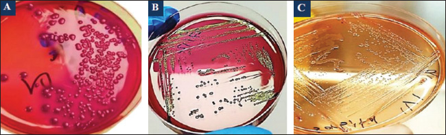 Fig. 2. Colonies of E. coli isolates on MacConkey agar (A), eosin-methylene blue agar (B), and sorbitol MacConkey agar (C). Targeting the 16S rRNA gene, 78.95% (15/19) of suspected E. coli isolates were positive by conventional PCR assay (Figs. 3 and 4). Sequencing data of all positive E. coli strains were named (Iraq-Dog1-Iraq-Dog15) and submitted to the NCBI-GenBank under specific accession numbers (PV472073.1-PV472087.1). Phylogenetic analysis of the E. coli strains was performed using the MEGA software tools, which detected the presence of nucleotide similarity (*) and substitution/mutation at 98.42%–99.76% and 0.0047%–0.0085%, respectively, with the NCBI-BLAST Iraqi strain (LC844819.1) (Figs. 5 and 6, Table 3). Regarding the serological investigation of immune markers and antioxidants, significant variation was identified among the positive and negative dogs for E. coli infection. Significantly (p < 0.05), the findings of IL-1 (51.358 ± 3.623 pg/ml), IL-6 (127.263 ± 10.249 pg/ml), IL-8 (828.105 ± 71.352 pg/ml), and MDA (304.842 ± 7.897 ng/ml) were elevated in positive dogs to E. coli infection when compared to those of negative infections (26.126 ± 1.206, 52.415 ± 3.036, 358.075 ± 23.678, and 180.268 ± 10.531 ng/ml, respectively); however, significant reduction was observed in values of IL-2 (33.195 ± 3.915 pg/ml), CAT (0.585 ± 0.048 ng/ml), GSH (3.524 ± 0.415 µg/ml), and SOD (236.526 ± 14.907 pg/ml) in comparison with those of negative infections (87.788 ± 5.833, 0.654 ± 0.034, 5.65 ± 0.324, and 388.39 ± 37.71 pg/ml, respectively). No significant differences (p > 0.05) were seen in values of INF-α among the positive (31.547 ± 2.247 pg/ml) and negative E. coli infections (31.31 ± 2.66 pg/ml), (Figs. 7– DiscussionDogs are the most successful canines that were kept as pets by many people all over the world irrespective of their social status, and most of these dogs were kept as watch, companion animals, and as a guide for the handicapped forces (Rakha et al., 2015). In the present study, diarrhea, abdominal pain, and vomiting were the most identified gastrointestinal disorders, and these findings are in agreement with those of other studies (Volkmann et al., 2017; Furukawa et al., 2022; Skotnitzki et al., 2022). However, multiple differential diagnostic approaches must be considered in patients with gastrointestinal signs and other systemic metabolic or toxic disorders (Holzmann et al., 2023). The prevalence observed in this study (14.96%) falls within the range reported in other regions: 8.9% in Germany (Werhahn Beining et al., 2023), 11.54% in the UAE (Habib et al., 2023), 22.2% in Turkey (Aslantaş and Yilmaz, 2017), 24.2% in Ethiopia (Gebremedhin et al., 2021), 24.3% in India (Mustapha and Goel, 2020), 31.3%–43.1% in Brazil (Carvalho et al., 2016), 44.8% in the UK (Wedley et al., 2017), 47.1% in Iran (Torkan et al., 2016), and 63.75% in China (Zhou et al., 2022). This variation might be attributed to the animal (age, sex, and health status), pathogen (strain and prevalence rate of resistance genes), and environmental (contamination level) factors in addition to the diagnosis protocol. Concerning the antibiotic susceptibility testing, our findings recorded the higher sensitivity of E. coli strains to meropenem and levofloxacin than to ciprofloxacin, colistin, imipenem, ceftazidime, nitrofurantoin, nalidixic acid, ofloxacin, amikacin, azithromycin, gentamicin, cefotaxime, ceftriaxone, and cefepime. However, remarkable resistance was detected to amoxicillin and ampicillin. In Iraq, Yousif et al. (2017) found that E. coli had a high sensitivity to ciprofloxacin (80.76%) and the highest resistance to cephalexin (100%), ampicillin and erythromycin (96.14%), and chloramphenicol (88.46%). Another recent study recorded the significantly higher sensitivity of E. coli isolates to ciprofloxacin (80%), gentamycin, and levofloxacin (60%), whereas the highest resistance rates were shown to cefotaxime and tetracycline (60%) (Kadhim and Alrammah, 2024). Internationally, Naziri et al. (2015) reported the highest resistance to ampicillin (100%), followed by amoxicillin (96.6%), trimethoprim-sulfamethoxazole (57.1%), and imipenem (5.5%) and meropenem (2.3%). However, the difference in sensitivity to antimicrobial agents might be attributed to variation in the prevalence of resistance genes encoded by the chromosomes and plasmids harbored by bacterial organisms, as detected by Torkan et al. (2016), who molecularly demonstrated the variable distribution of antimicrobial genes in pathogenic E. coli isolates [64.3% to ampicillin, 42.9% to streptomycin and cephalothin, 35.7% to tetracycline and trimethoprim, 21.4% to sulfonamide and chloramphenicol, 14.3% to fluoroquinolone, and 7.1% to erythromycin]. Aslantaş and Yilmaz (2017) confirmed the occurrence of various β-lactamase genes in E. coli isolated from dogs alone or in combination. Erzaim and Ikiz (2021) detected a lack of plasmid-mediated mcr-1 gene, though resistance to colistin has been found, indicating the presence of many genes for resistance or that the chromosome is responsible for resistance. However, routine antibiotic therapy in dogs might increase the number of E. coli-resistant strains (Schmidt et al., 2018). Close contact between dogs and humans might play a role in the transmission of antimicrobial resistance bacteria. Additionally, pet and stray dogs may act as antimicrobial-resistant E. coli reservoirs (Marchetti et al., 2021). Table 2. Antibiotic susceptibility of 19 positive E. coli isolates as determined by culture and biochemical tests.
