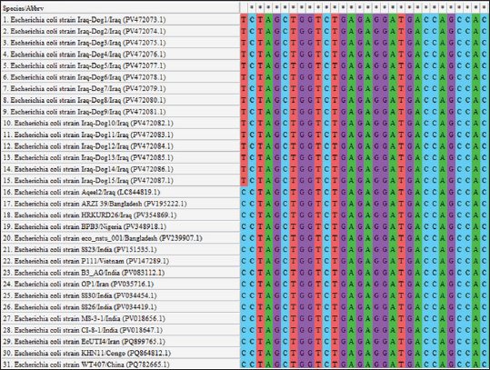 Fig. 5. Multiple sequence alignment of local and global NCBI-GenBank E. coli strains using MEGA-11 software.