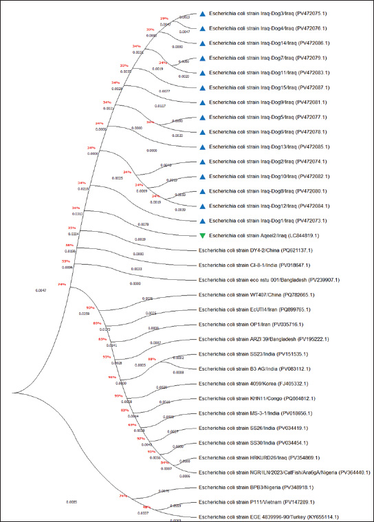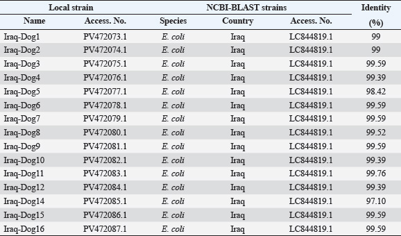 Fig. 6. Phylogenetic tree analysis of local and global NCBI-GenBank E. coli strains using MEGA-11 software. In this study, molecular testing of E. coli isolates revealed that only 78.95% were positive by conventional PCR, which was phylogenetically identical to the NCBI-BLAST Iraqi strain (LC844819.1) isolated from chicken. These findings confirm the hypothesis that E. coli could be transmitted directly or indirectly from animal to animal or from animal to human and vice versa, indicating zoonotic importance (Bélanger et al., 2011; Etcheverría et al., 2016; Merkeviciene et al., 2018). Table 3. Homology sequence identification for local and NCBI-GenBank BLAST E. coli isolates/strains.