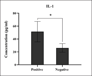 Fig. 7. Levels of immune IL-1 marker among the positively (total number=19) and negatively (total number=108) infected dogs with colibacillosis; significance * (p < 0.0241).
