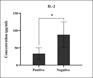 Fig. 8. Levels of immune IL-2 marker among the positively (total number=19) and negatively (total number=108) infected dogs with colibacillosis; significance * (p < 0.0116). Serological quantification of immune and antioxidant markers in positively infected dogs with colibacillosis revealed a significant variation in their values. For immune markers, the findings of dogs positive for colibacillosis described significant elevation in IL-1, IL-6, and IL-8, with significant reduction in IL-2; however, no significant changes were shown in INF-α. Worldwide, various data were obtained during E. coli infection in both animals and humans. In a previous study, Wakabayashi et al. (1991) reported that a specific receptor antagonist for IL-1 prevents E. coli-induced shock in rabbits. Van Heeckeren et al. (1993) reported that TNF-α, IL-1α, IL-6, and prostaglandin E2 were produced in murine peritoneal macrophages infected with E. coli. In 2001, Brauner et al. (2001) identified that E. coli can induce the expression of IL-1 (α, β), IL6, and IL-8 in normal human thymic epithelial cells. In dogs, Karlsson et al. (2015) reported that pathogenic E. coli enhances the expression of IL-8 in endometrial stromal cells, while other researchers observed that E. coli can stimulate the production of TNF-α, IL-6, and IL-10 (Hoffman et al., 2018; Merrill et al., 2021). Recently, Nagao et al. (2024) reported that pathogenic E. coli can induce acute colitis in dogs, leading to signs similar to those observed in humans, disrupting intestinal barrier integrity, and increasing the production of IL-8 and TNF-α.