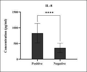 Fig. 10. Levels of immune IL-8 marker among the positively (total number=19) and negatively (total number=108) infected dogs with colibacillosis. ***** (p < 0.0001).