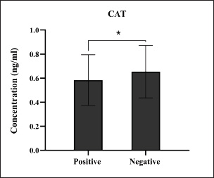 Fig. 12. Levels of antioxidant CAT marker among the positively (total number=19) and negatively (total number=108) infected dogs with colibacillosis; significance * (p < 0.0461). Among the molecularly positive dogs to colibacillosis, the findings of antioxidants were reported a significant reduction in values of CAT, GSH, and SOD but a significant increase in values of MDA as reported by Yazlık et al. (2023) Worldwide, several studies have demonstrated that damage developed during various infections is attributable to oxidative stress due to endogenous and exogenous production of reactive oxygen species (ROS) and elaborating of antioxidants to limit the damage developed by bacterial infections (Pohanka, 2013; Paiva and Bozza, 2014; Sarkar and Sil, 2019). In addition to the direct antimicrobial effects of ROS, these molecules can act as signaling molecules, modulating the inflammatory response and influencing the recruitment of immune cells to the site of infection (Li et al., 2017; Memar et al., 2018; Banerjee et al., 2020). The interplay between bacterial virulence factors, host immune responses, and oxidative stress determines bacterial infection severity and progression (Chamoun et al., 2018). However, bacterial pathogens employ diverse strategies to manipulate the host’s oxidative stress response to their advantage by either directly inducing ROS production, thereby causing oxidative damage to host tissues and promoting bacterial dissemination, or suppressing the host’s antioxidant defenses (Kim et al., 2019; Sahu et al., 2022).