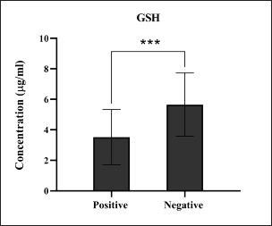 Fig. 13. Levels of antioxidant GSH marker among the positively (total number=19) and negatively (total number=108) infected dogs with colibacillosis; significance *** (p < 0.0006).