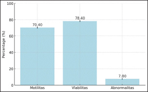 Fertility PerformanceFrozen semen produced from sexed sperm using Bovine Serum Albumin (BSA) and Albumin media was utilized for artificial insemination (AI). The semen freezing process followed the protocols described by Diansyah et al. (2023), while the AI procedure adhered to the guidelines outlined by Prasad et al. (2021). The fertility performance of sexed sperm was evaluated based on the pregnancy rate, defined as the proportion of sheep that became pregnant out of a total of 300 sheep inseminated during each estrous cycle (Mohar et al. 2022). Statistical AnalysisThe observed parameters included sperm quality, sperm kinematics, validation of sperm sexing, and pregnancy rate. Data were reported as mean ± standard deviation (Mean ± SD). Before statistical analysis, all parameter values were tested for normality and homogeneity of variances using the Kolmogorov-Smirnov test. Since the data did not follow a normal distribution, comparisons between sperm sexing methods (BSA and Albumin) were performed using the non-parametric Mann-Whitney U test. Differences were considered statistically significant at p < 0.05. Additionally, Pearson correlation analysis was conducted to evaluate the relationships among all observed parameters, including sperm quality, sperm kinematics, validation of sperm sexing, and pregnancy rate. All statistical analyses were performed using SPSS version 25 for Windows (IBM Corp., Chicago, IL, USA). Ethical ApprovalEthical approval for this research was obtained from the Animal Care and Use Committee of the National Research and Innovation Agency (Reference No. 204/KE.02/SK/11/2023). ResultsSperms Quality and Kinematic SeparationThe sperm quality before the sexing of Garut rams, including motility, viability, and sperm abnormality were presented in Figure 1. The average sperm motility, sperm viability, and sperm abnormality were 70.40%, 78.40%, and 7.80%, respectively. All sperm quality is an initial test before further semen processing treatment is carried out. After the sexing of Garut rams, the sperm quality was presented in Figure 2..The average sperm motility of Garut rams after sexing is higher in Y-sexed sperm on the BSA medium than in Y-sexed sperm on the Albumin medium. Furthermore, the viability of Garut rams sperm after sexing in X-sexed and Y-sexed sperm in each medium has an average of 74-75%. The abnormalities of Garut rams sperm after sexing have the highest average in the abnormality of X-sexed sperm on albumin media (11.2%) and the lowest in Y-sexed sperm on albumin media (6.28%). However, sperm motility, sperm viability, and sperm abnormality of X-sexed and Y-sexed between BSA and Albumin medium showed no significant difference (p>0.05).