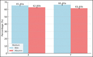 Figure 9: Validation of X and Y Sperms Fraction of Garut Rams; Means with different superscripts differ on the same sperm sexed significantly at p < 0.05. Fertility Performance Post-Artificial InseminationThe timing of AI, reproductive health, semen quality, and environmental factors are critical determinants of pregnancy rates in cows. Optimizing these factors through careful management and monitoring can significantly enhance reproductive success. Fertility performance after artificial insemination resulted (shown in Fig. 10) in varying mean percentage values and showed significant differences (p<0.05). The percentage of fertility performance of sexed-X sperm was higher in BSA medium compared to Albumin medium, 62.80% and 56.60% respectively, the same thing happened to the fertility performance of sexed-Y sperm 63.40% and 57.80% respectively. Knowing the fertility performance of X and Y sperm will provide many benefits that can improve the selection of the right method of sperm sexing. DiscussionGarut rams is highly valued in Indonesia, not only for their exceptional meat production but also for its cultural significance (Rusdiana et al. 2021; Sujarwanta et al. 2024). As an integral part of both the economy and traditional practices, Garut rams plays a vital role in Indonesia’s agriculture and livestock industry (Maulana et al. 2022). Given the growing demand for efficient breeding techniques, sperm sexing technology has become essential in enhancing meat production and milk yields in Garut rams by enabling controlled selection of offspring gender (Rusdiana et al. 2021; Dovenski et al. 2022). This study assessed the efficacy of BSA column and Albumin column methods for sperm sexing in Garut rams, providing valuable insights into their potential for improving the efficiency and productivity of this breed. The quality of sperm is a crucial determinant of successful artificial insemination (AI), as it directly impacts the ability of sperm to reach and fertilize the oocyte. This study found that BSA column was more effective in preserving motility than Albumin column, which is essential for successful fertilization. Although viability did not differ significantly between the two methods (p>0.05), the BSA column better maintained membrane integrity, which is crucial for sperm capacitation and acrosomal reaction during fertilization (Maulana et al. 2022). Utami et al. (2025), concluded that 20%-65% gradient was more effective in maintaining sperm quality, further more Post-sexing motility and kinetic parameters were reduced compared to fresh semen Holstein-Friesian bulls. Nurcholis et al. (2024), has found that 2%:4% Ophiocephalus striatus fish albumin extract (OSAE) concentration produced the highest sperm motility and viability post-thawing, while the 4%:6% concentration was effective for separating X and Y sperm of Brahman cross bulls. In the meantime, Yendraliza et al. (2023), founded that adding up to 0.4% sucrose to Tris-Egg Yolk Diluent maintained motility, viability, and integrity of cell membranes and acrosomes in sexed sperm. Furthermore, kinematics, including progressive velocity (VSL) and curvilinear distance (DCL), were significantly improved in sperm separated using BSA column. This enhanced kinematic performance suggests that sperm separated by BSA column are more efficient at navigating toward and interacting with the oocyte, thereby increasing the likelihood of successful fertilization (Sahiruddin et al. 2021). In contrast, sperm separated by the Albumin column exhibited reduced kinematic performance, likely due to the viscosity of the medium, which increases osmotic stress on sperm, thereby impairing their motility and movement efficiency (Afriani et al. 2022).