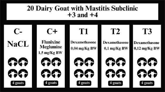 Fig. 1. Treatment design. ResultsThe Shapiro–Wilk normality test results for cortisol and LH indicated that the data were normally distributed, with a significance value of p > 0.05. The post hoc Duncan test results showed that cortisol levels, as shown in Table 1, in the C-group were significantly different (p < 0.05) from the T1, T2, and T3 groups but not significantly different from the C+ group. Cortisol levels in the C+ group were significantly different from T1 and T2 but not from C- and T3. Cortisol levels in T1 were significantly different from C- and C+ but not from T2 and T3. The T2 group showed significant differences from C-, C+, and T3 but not from T1. Finally, the T3 group exhibited significantly different cortisol levels from C- and T2 but not from C+ and T1. The statistical analysis using one-way ANOVA and Duncan’s post hoc test in Table 2 demonstrated that dexamethasone administration significantly affected LH levels in dairy goats with subclinical mastitis (p=0.00; p < 0.05). C- was not significantly different from T1 and T2 but was significantly different from C+ and T3. C+ was not significantly different from T1, T2, or T3 but was significantly different from C-. T1 was not significantly different from C-, C+, and T2 but was significantly different from T3. T2 showed no significant difference with C-, C+, T1, or T3. T3 was not significantly different from C+ and T2 but significantly different from C-. DiscussionPhysiological saline lacks therapeutic properties to alleviate inflammation or stress. Anti-inflammatory agents can reduce cortisol concentrations by inhibiting pro-inflammatory and pain mediators, thereby minimizing stress associated with mastitis (Dalanezi et al., 2020; Alhussien et al., 2021). A low dose of dexamethasone may not have effectively inhibited the secretion of corticotropin-releasing hormone (CRH) from the hypothalamus and ACTH from the pituitary gland, allowing cortisol synthesis and release from the adrenal cortex to continue, albeit at a lower level (Kageyama et al., 2021). Dexamethasone at the appropriate dose significantly reduced cortisol levels through a negative feedback mechanism on the HPA axis. Dexamethasone inhibits the secretion of CRH from the hypothalamus and ACTH from the pituitary gland, thereby reducing the stimulation of cortisol synthesis and release from the adrenal cortex. Endocrine glucocorticoid changes occur primarily during the early phase of inflammation (Lea et al., 2024). Table 1. Cortisol levels (ng/ml) with a treatment in female dairy goats with subclinical mastitis (n=20).