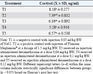 ABSTRACTBackground: Dairy goats are small ruminants with high potential in the livestock industry but are susceptible to mastitis infection, which can reduce milk productivity. Dexamethasone is one therapy used in the treatment of mastitis. Its excessive use can cause oxidative stress, inhibit follicle development, and interfere with reproduction. The stress experienced due to mastitis also increases cortisol hormone levels and decreases LH levels. Aim: This study aimed to evaluate the effect of dexamethasone administration on luteinizing hormone (LH) and cortisol levels in dairy goats with subclinical mastitis. Method: This research is a laboratory experimental study with completely randomized design. A total of 20 dairy goats with subclinical mastitis were divided into five treatment groups. C- group was given physiological NaCl 0.9%; C+ was given Flunixin Meglumine® 1,5 mg/kgBW, whereas the treatment group was given dexamethasone at a dose of 0.04 mg/kgBW (T1), 0.1 mg/kgBW (T2), and 0.12 mg/kgBW (T3) via intramuscular for five consecutive days. Blood samples were taken from the jugular vein on the sixth day. LH and cortisol levels were tested using an enzyme-linked immunosorbent assay. Result: The administration of dexamethasone at a toxic dose of 0.12 mg/kgBW and Flunixin Meglumine® at a therapeutic dose of 50 mg/kgBW significantly reduced LH levels. In addition, statistical analysis with the one-way ANOVA test showed that dexamethasone administration decreased cortisol levels (p < 0.05). Duncan’s post hoc test showed significant differences between treatment groups and negative and positive controls (p < 0.005). Conclusion: Dexamethasone administration to dairy goats with subclinical mastitis can reduce LH and cortisol levels, potentially affecting livestock reproduction and productivity. Keywords: Dairy goats, Subclinical mastitis, Dexamethasone, LH hormone, Cortisol. IntroductionThe Siliragung District in the southern region of Banyuwangi Regency has emerged as a leading area for dairy goat farming. According to data from the Banyuwangi Regency Agriculture and Food Service in 2020, the population of dairy goats reached 3,992 (BPS, 2021; Putri et al., 2021). Goats are highly adaptable and productive compared with other livestock, making them an excellent choice for cultivation in Indonesia (Mardian et al., 2020). Goat milk has less fat than cow milk; therefore, it is a nutritional option for dietary and fat reduction (Radiati et al., 2022). Mastitis or udder inflammation, one of the most common infections, can negatively affect dairy goat productivity (Pribadi et al., 2020). Significant farm economic repercussions because more than 60% milk production which poses (Suwito, 2014). An optimal biosecurity system on a goat farm can minimize the risk of diseases (Putri et al., 2023). Mastitis is inflammation of the mammary glands that can be recognized by physical changes in the udder or alterations in milk secretion due to physical trauma or infectious agents (Pradika et al., 2019). Increased somatic cells in the milk characterize subclinical mastitis without noticeable udder swelling. It is caused by inadequate farming, milking management, and bacterial contamination from feces, bedding, feed, or milking equipment (Sevitasari et al., 2019; Sukoco et al., 2022). This condition impacts the mammary glands and triggers a systemic immune response, leading to endocrine changes that induce stress in the animals and increase cortisol production by the adrenal cortex (Ibrahim et al., 2023). The prevalence of subclinical mastitis in goat farms is approximately 30%, potentially resulting in substantial losses due to decreased milk yield. This disease can only be identified through the California Mastitis Test (CMT), which detects bacterial infections such as Staphylococcus aureus and Escherichia coli in the udder (Suwito, 2014). The prevalence rate of subclinical mastitis has reached 64.51% in the Siliragung District (Faizah et al., 2023). Treatment of inflammation in livestock generally uses anti-inflammatory drugs such as corticosteroids and nonsteroidal anti-inflammatory drugs (NSAIDs) can effectively relieve inflammatory reactions. However, the long-term use of these drugs causes adverse health side effects (Neman et al., 2022). NSAIDs, including flunixin meglumine, function by inhibiting the enzyme cyclooxygenase, thereby blocking the production of inflammatory mediators such as eicosanoids (Knych, 2017). Additionally, NSAID administration during ovulation may disrupt the follicular environment and the dominant follicle’s response to luteinizing hormone (LH) stimulation, potentially impacting oocyte maturity (Von-Wolff et al., 2024). Corticosteroids are commonly used for their capacity to modulate the body’s immune response (Ferrara et al., 2019). Stress in livestock, such as that caused by mastitis, can elevate the production of glucocorticoid hormones, particularly cortisol, which is released during periods of stress. This stress can negatively affect livestock milk production and reproductive performance (Herman et al., 2016). However, treatments often prove ineffective when conducted without veterinary supervision, such as administering medications without a prescription or neglecting to consider the appropriate dosage, a common practice in the field (Panie et al., 2022; Detha et al., 2021). One of the synthetic glucocorticoids with high anti-inflammatory potential is dexamethasone (Restuti, 2014). As an adrenocortical steroid, dexamethasone is used to treat inflammation at a relatively more affordable price than other corticosteroids. However, long-term excessive use can trigger hormonal disorders (Cendekiawan, 2019). Dexamethasone administration in livestock is often given to relieve inflammation due to pathogenic infections, including mastitis, by inhibiting inflammatory mediators and repairing damaged tissue (Sipka et al., 2013). High doses of dexamethasone can cause side eff
