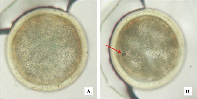Fig. 2. Bovine embryos resulting from IVF at the blastocyst stage. Magnification 200×. A=normal, B=apoptosis, arrow sign (red): cell fragmentation. IGF-1 stimulates the proliferation and differentiation of granulosa cells in various species, including sheep, rats, pigs, and humans (Dai et al., 2022). In addition, IGF-1 also increases steroidogenesis in theca cells and has been reported to promote the proliferation of granulosa cells in sheep from small follicles with a diameter of 1–3 mm (Ipsa et al., 2019). Lin et al. (2003) reported that the combination of IGF-1 and IGFBP-1 increased blastocyst formation and number via culture and verification in stem cell lines. IGF-binding protein-1 (IGFBP-1) plays an important role in the biological activity of IGF-1, with the presence of IGFBP-1 mRNA in the oviduct lumen mucosa, which increases when there is an embryo (Lewitt and Boyd, 2024). Embryo culture in coculture media can increase the expression of IGFBP-mRNA, thereby strengthening the activity of IGF-1 during embryo development (Thongkittidilok et al., 2014). The results of monolayer cultures of bovine cumulus cells indicate the presence of materials with mitogenic properties that can be used as supplements in in vitro embryo culture media, contributing to increased cleavage rates and embryo development (Zhang et al., 1995). In the media produced from monolayer cell cultures impregnated with anti-P4, the antimitogenic effects of progesterone have been eliminated, allowing IGF-1 and estrogen in the monolayer cell culture fluid to function optimally as mitogenic materials (McDermott et al., 2025). This allows an increase in the number of embryos that undergo cleavage and develop into the morula. This study produced growth factor IGF-1 and steroid hormone estrogen from a monolayer culture of bovine cumulus cells. This product can be used as a supplement in media for IVF and embryo development, with the aim of increasing the cleavage rate and embryo development to the morula phase. In cattle, embryo developmental block, also known as developmental block, is often observed at the 8-cell stage and is related to the quality of the oocyte cytoplasm (Meirelles et al., 2004). The utilization of media supplements from monolayer cultures of bovine cumulus cells can help prevent these developmental obstacles (Hashimoto et al., 1998). The study showed that the addition of IGF-1 and estrogen obtained from culture as a media supplement can increase the cleavage rate and embryo development to the morula phase. IGF-1 and estrogen act as mitogenic agents by inhibiting the release of the proapoptotic protein p53 (Gallagher and LeRoith, 2010). This inhibition causes the suppression of the transcription factor p21, which then activates cyclin-dependent kinases (CDKs). CDK activation then leads to the occurrence of the cell cycle, which culminates in mitosis, proliferation, and cell differentiation (Baker and Reddy, 2012). Thus, the results of embryo cultures that experienced increased cleavage and development when supplemented with IGF-1 and estrogen media showed a significant increase compared with embryos that did not receive the supplements. Embryo apoptosis in cultureResearch by Makarevich and Markkula (2002) reported that IGF-1 functions as a mitogenic and antiapoptotic agent that supports cell proliferation during oocyte maturation, production, and in vitro embryo culture in cattle. In the study, it was found that in the oocyte maturation process using media enriched with IGF-1, the percentage of apoptosis measured by TUNEL assay was 0%, whereas in the control media without IGF-1, it reached 9.87% (p < 0.05). In addition, measurements of active caspase showed a significant difference in the percentage of apoptosis, which was 1.13% in media containing IGF-1, compared with 2.08% in control media (p < 0.05). These findings suggest that IGF-1 functions as an antiapoptotic factor during oocyte maturation, helping to inhibit apoptosis in oocytes during the caspase activation phase, as well as preventing oocyte progression toward apoptosis. In addition, it is known that insulin and IGF-1 can accelerate blastocyst development and prevent apoptosis (Herrler et al., 1998). Quirk et al. (2004) also highlighted the importance of growth factors and steroids in the regulation of ovarian follicle development. In cows, significant differences can be seen, where healthy dominant follicles have a greater ability to produce IGF and estradiol than subordinate follicles that experience atresia. IGF-1 and estradiol have also been shown to promote granulosa cell proliferation in vitro and enhance their survival by increasing resistance to apoptosis. The ability of IGF-1 and estradiol to increase resistance to apoptosis contributes to the enhancement of the cell development cycle (Quirk et al., 2004). Velazquez et al. (2009) reported the important role of IGF-1 in follicle growth, oocyte maturation, embryo viability, and reducing the level of apoptosis in bovine embryos. Apoptosis can occur physiologically or pathologically. Physiological apoptosis is cell death that is programed to occur in a certain period due to the inactivation of telomerase, an enzyme that plays a role in the formation of telomeres at the ends of chromosomes (Bekaert et al., 2004). Meanwhile, pathological apoptosis is caused by environmental factors such as infection (viruses or bacteria), stress, free radicals, hormones, and cytokines, with mechanisms involving various pathways, including the intrinsic pathway (mitochondrial), p53, and extrinsic pathways (Fas and Fas Ligand) (O’Brien and Kirby, 2008). Estrogen and IGF-1 inhibit apoptosis through the intrinsic pathway (mitochondrial) by increasing the production of antiapoptotic proteins such as Bcl-2 and Bcl-x and reducing proapoptotic proteins such as Bak, Bax, and Bim (Chimento et al., 2022). Increased levels of Bcl-2 and Bcl-x inhibit the release of cytochrome c from mitochondria, preventing the co