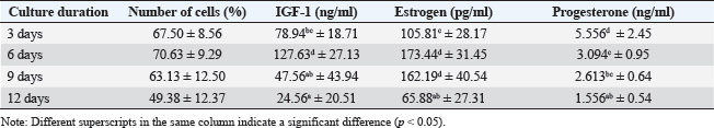 ABSTRACTBackground: Ovaries have the ability to produce insulin-like growth factor-1 (IGF-1) and estrogen, but both of these factors can also be produced through monolayer cell cultures of cumulus oophorus tissue with the addition of precursor materials such as fetal calf serum (FCS) or bovine serum albumin (BSA). Aim: This study aimed to determine the bioactivity of IGF-1 and estrogen obtained from bovine cumulus cells in the context of in vitro fertilization (IVF). Methods: Cumulus cells were harvested from ovarian follicles measuring 2–6 mm and cultured in TCM 199 supplemented with 10% FCS and 10% BSA. The IGF-1, estrogen, and progesterone levels were quantified using the immunoradiometric assay and radioimmunoassay techniques. To lower progesterone concentrations within the culture, a binding technique using antiprogesterone (anti-P4) coated tubes was applied. The culture media served as both a supplement for IVF and an environment for embryo culture. The study assessed the mitogenic and antiapoptotic properties of IGF-1 and estrogen by measuring the reduction of apoptosis in embryos. Findings revealed that incubating for 6 days resulted in the greatest cell monolayer confluency. Results: The anti-P4 effectively reduced progesterone levels in the culture of cumulus cells. The cleavage rates for embryos with and without progesterone absorption were 27.48% and 53.61%, respectively, whereas the rates of morula embryos increased from 5.73% to 27.59%. Additionally, supplementation decreased apoptosis rates from 70.58% to 31.01%. Conclusion: In summary, the monolayer culture of bovine cumulus cells generated IGF-1 and estrogen, which functioned as mitogenic agents, positively influencing IVF outcomes and embryo development while significantly decreasing apoptosis in the embryos. Keywords: Abattoir waste product, Apoptosis, Food production, Ovarian, Morula. IntroductionThe growth of the cattle population in Indonesia plays a crucial role in supporting the Free Nutritious Meals initiative, which aims to improve the health and nutrition of communities, especially children and vulnerable groups (Hilmiati et al., 2024). Beef is a source of animal protein rich in nutrients, such as iron, vitamin B12, and essential amino acids that are essential for optimal growth and development (Geiker et al., 2021). By increasing the cattle population, Indonesia can ensure the availability of sufficient beef to meet the nutritional needs of the community. The Free Nutritious Meals initiative will be able to provide appropriate portions of beef, thereby contributing to increasing individual protein and nutrient intake (Sarjito, 2024). In addition, increasing the cattle population can reduce the dependence on imported meat. Indonesia, as a country with a large population, faces challenges in meeting its meat needs (Kusumaningrum et al., 2024). By developing local livestock farming, Indonesia can achieve food independence that supports price stability and product quality, which is very important for the sustainability of nutritious food supplies (Rozaki, 2021). In addition, the government must ensure that an increase in the cattle population has a positive impact on the welfare of local farmers (Fathan et al., 2024). Supporting farmers in investing in better livestock farming can improve their incomes and quality of life (Banda and Tanganyika, 2021). Therefore, Free Nutritious Meals not only provide nutritional benefits but also help improve the economy of livestock farming communities through the demand for local beef. The program also raises awareness of the importance of local products. By emphasizing domestic food products, people will recognize and appreciate products from local farms more (Hilmiati et al., 2024). This will contribute to the development of a more sustainable livestock industry, as well as having a positive impact on the environment and agricultural ecosystems. Collaboration between the government, farmers, and communities is essential in supporting the Free Nutritious Meals initiative (Sarjito, 2024). Policies that support increasing cattle populations, education on good livestock practices, and access to modern technology will form an ecosystem that supports the success of the program (Martyniuk, 2021). Thus, increasing the cattle population in Indonesia is an important step in line with the goal of creating free nutritious meals. This not only helps the availability of nutritious food but also contributes to food independence, farmer welfare, and sustainable local economic development. In terms of improving livestock quality, the application of biotechnology is very relevant. An effective method to improve reproduction is through embryo transfer techniques (D’Angelo et al., 2022). The success of this technique depends on the quality of the embryos produced; however, in vivo embryo production is limited by the capacity of donor female livestock (Salek et al., 2025). Therefore, embryo production using in vitro methods is a promising alternative. Growth factors such as insulin-like growth factor-1 (IGF-1) and estrogen hormones play an important role in stimulating and regulating cell growth (Ipsa et al., 2019). IGF-1 is a polypeptide produced by the liver and other tissues in response to growth hormone, whereas estrogen is produced by follicles in the ovaries (Khan et al., 2025). Both have paracrine, autocrine, and endocrine functions in stimulating mitogenic activity in cells. The ovaries have the ability to produce IGF-1 and estrogen, but both of these factors can also be produced through monolayer cell cultures of cumulus oophorus tissue with the addition of precursor materials such as fetal calf serum (FCS) or bovine serum albumin (BSA) (Vandaele and Van Soom, 2011). Based on this, there is still a rare research on the production of growth factors and sex steroids, such as estrogen and progesterone, from cumulus cell monolayer culture fluid using cow ovaries from slaughterhouses. This