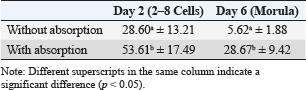 Table 2. Percentage of embryo development without and with progesterone absorption.