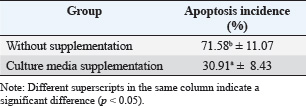 Fig. 1. Results of the development of bovine embryos cultured in media containing IGF-1 and estrogen at the 8-cell (A), 16-cell (B), and morula (C) stages. Magnification 200×. In this study, IGF-1, estrogen, and progesterone were detected in monolayer cell culture products from bovine cumulus cells. Cumulus cells not only function as nutrient providers during the processes of oogenesis and folliculogenesis in the ovaries, but they are also able to produce IGF-1 (Piau et al., 2023). Estrogen is a C18 steroid that does not have an angular methyl group at position 10 or a ∆4-3-keto configuration on the A ring, with a molecular weight of approximately 272 Da (Dembitsky, 2024). During the productive phase, the main form of estrogen found in the blood circulation is estradiol-17β, which is produced at a rate of 80–500 µg per day (Reslan and Khalil, 2012). In the blood, estradiol is found in a free state of 2%, 60%, and 38% bound to albumin, gonadal steroid-binding globulin (Hammond, 2011). Sex hormone-binding globulin (SHBG), a glycoprotein produced by hepatocytes, is the largest sex hormone-binding protein in plasma and plays a role in influencing the bioavailability of estrogen for tissue response to hormones (Winters et al., 2014). In addition, SHBG is influenced by steroid hormones, peptide hormones, T4, nutritional status, and fluctuations in estrogen levels (Narinx et al., 2022). Table 3. Percentage apoptosis in embryos cultured without or with the addition of cumulus cell culture media.