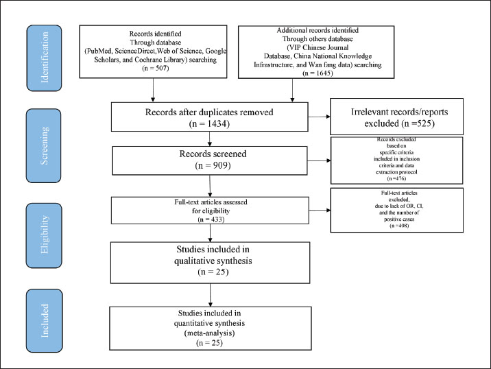AbstractBackground: Newcastle disease is an extremely contagious and economically damaging poultry disease caused by Avian orthoavulavirus 1 [Newcastle disease virus (NDV)], a member of Paramyxoviridae. Aim: This study was conducted as a systematic review and meta-analysis aimed at assessing NDV prevalence among poultry populations in mainland China. Methods: A total of 25 relevant epidemiological studies published between 1979 and 2023 were analyzed following the MOOSE guidelines. Results: Our meta-analysis revealed an overall NDV prevalence of 2.17% (95% CI: 1.95%–2.42%) with significant heterogeneity (I2=97.1%, p < 0.001). Southern China exhibited the highest individual study prevalence, while southwestern regions reported the lowest (0.32%). No aggregated regional prevalence exceeded 10%, suggesting localized outbreaks. Prevalence decreased from 3.19% (before 2013) to 1.03% (post-2013 era), reflecting improved biosecurity and vaccination. RT-PCR-based studies showed lower heterogeneity (I2=89.5%) compared to serological assays (I2=97.1%), highlighting the challenges in comparing prevalence estimates across different diagnostic methods and underscoring the need for standardized diagnostics.emphasizing the need for standardized diagnostics. Publication Bias: Funnel plot asymmetry indicated underrepresentation of small-scale studies (p=0.003). Conclusion: These results highlight persistent NDV challenges in high-density poultry areas (e.g., southern China) and underscore the importance of molecular diagnostics (RT-PCR) for accurate surveillance. Given persistent hotspots in high-density poultry areas (e.g., Guangdong), targeted vaccination and region-specific biosecurity measures are critical to mitigating NDV transmission. Keywords: Systematic review, Newcastle disease virus, China, Epidemiology, Poultry. IntroductionNewcastle disease virus (NDV; avian orthoavulavirus 1, APMV-1) is a highly contagious negative-sense RNA virus belonging to the Paramyxoviridae family (Abd Elfatah et al., 2021). It exhibits significant genotypic diversity and variable pathogenicity, resulting in a broad spectrum of clinical manifestations in avian hosts. These range from mild respiratory or digestive signs to severe, often fatal, systemic disease characterized by respiratory distress, neurological symptoms (e.g., paralysis and tremors), decreased production, and high mortality (Absalón et al., 2019). A substantial proportion (approximately 20%) of infections result in asymptomatic carriers, posing significant challenges for disease surveillance and control (Cattoli et al., 2011). Since its initial identification in 1926, the virus has spread efficiently through direct contact, respiratory secretions, feces, contaminated fomites, feed, water, and via migratory birds, facilitating its global dissemination (Apopo et al., 2019; Lu et al., 2021). Introduced in China in the 1930s, NDV has since caused recurrent outbreaks, inflicting substantial economic losses through mortality and culling (Lu, 2009; Yu, 2014; Zhang, 2016; Wei, 2018; Qiao, 2020). Comprehensive national control strategies, including quarantine, vaccination, and stamping-out policies, have been implemented (Feng et al., 2016; Duan et al., 2017; Jia et al., 2022). Despite these efforts and widespread vaccination, NDV remains endemic, with identified persistent transmission hotspots, particularly in southern China. Regional epidemiological studies consistently report the highest prevalence rates in the south, contrasting markedly with lower rates observed in southwestern regions (Huang, 2017). This geographical disparity underscores the country’s complexity of NDV epidemiology. Accurate quantification of NDV prevalence and understanding its epidemiological drivers are crucial for refining control strategies, optimizing vaccination programs, and mitigating economic impacts (Liu et al., 2019). Although numerous regional studies exist, a comprehensive synthesis of NDV prevalence across mainland China, accounting for spatial and temporal heterogeneity, is lacking. Therefore, this study aimed to conduct a systematic review and meta-analysis to provide a quantitative assessment of NDV prevalence in Chinese poultry populations, identify key associated factors, and inform evidence-based disease control approaches. Materials and MethodsStudy selectionAs per the MOOSE guidelines, a comprehensive search was conducted to identify all epidemiological studies reporting NDV prevalence in poultry populations within mainland China, published in English or Chinese between January 1, 1979, and June 25, 2023. The following electronic databases were systematically searched. English databases: PubMed, Google Scholar, Cochrane Library, and ClinicalTrials.gov. Chinese databases: VIP (Chongqing VIP Information Co., Ltd.), CNKI (China National Knowledge Infrastructure), and Wanfang Data. Search strategies utilized a combination of medical subject headings terms and keywords related to NDV (“Newcastle disease”, “ND”, “NDV”, and “Avian orthoavulavirus 1”), epidemiology (“epidemiology”, “prevalence”, “incidence”, and “surveillance”), poultry species (“poultry”, “chicken”, “duck”, “goose”, and “turkey”), and geographical scope (“China”). Boolean operators (AND, OR) were used to combine the terms. Specific search strings for each database are available upon request. The study selection process followed the PRISMA flow diagram (Fig. 1).