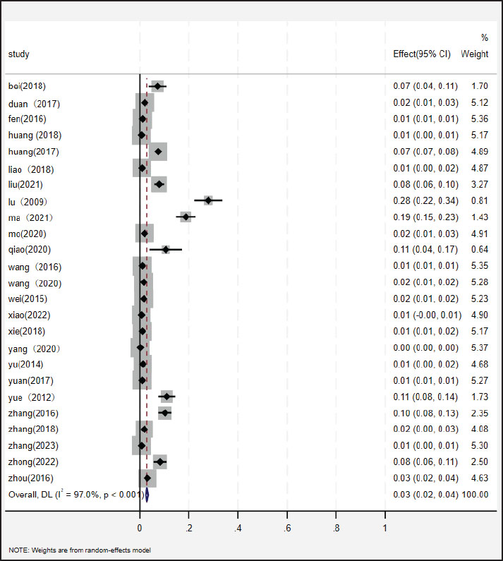 Fig. 3. Random-effects meta-analysis of NDV infection in poultry in mainland China. Methodological and regional influencesDetection methods: RT-PCR-based studies (n=25) showed lower heterogeneity (I2=89.5%) than serological assays. Throat/anal swabs, which detect active viral shedding, yielded higher detection rates (2.68%, 95% CI: 2.53%–2.83%) than serum/tissue samples (0.48%, 95% CI: 0.34%–0.66%), likely due to the environmental degradation of non-invasive samples. Poultry species: Chickens predominated (n=19 studies, 1.46% prevalence), while pigeons showed the highest infection rates (3.49%, 95% CI: 3.23%–3.76%). Publication bias and spatial patternsPublication bias: Funnel plot asymmetry (Fig. 2) and Egger’s test (p=0.003 and p=0.003, respectively) indicated underrepresentation of small-scale studies with low prevalence estimates. Trim-and-fill adjustment minimally altered the pooled prevalence (2.11%, 95% CI: 1.88%–2.36%), confirming the robustness of the results. Geospatial distribution: The NDV hotspot map (Fig. 4) identified sustained transmission in southern provinces (Guangdong, Guangxi), where high poultry density (>800 million birds), humid climates, and live poultry markets facilitated the spread of the disease. Conversely, the mountainous terrain and low-density farming in Southwest China correlated with minimal prevalence (Table 2).