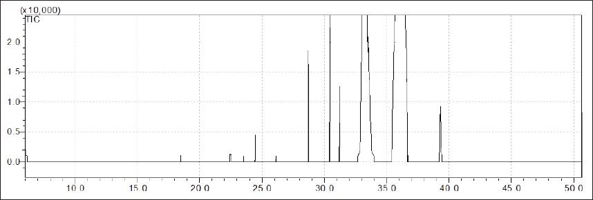 Fig. 3. GC/MS Chromatogram for dichloromethane (DCM) extracts of Calotropis procera.