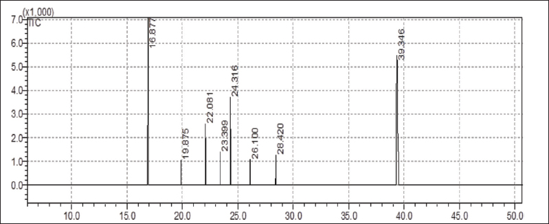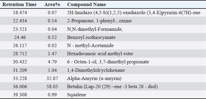 The GCMS analysis of the ethanolic extract’s primary active ingredients indicated betulin (58 %), α-amyrin (32.87%), 6-Octen-1-ol (4.79%), hexadecanoic acid methyl ester (1.47%), and Squalene (0.99 %) (Table 3, Fig. 2). Table 3. The constituents of ethanol extract of C. procera by GCMS.