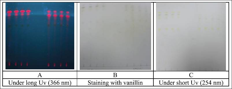 Fig. 4. TLC profile for extracts of Calotropis procera. DiscussionFrom the proximate, GCMS, phytochemical, and TLC analysis results, it is clear that C. procera is a very useful plant because it contains highly effective active ingredients. It has a promising medicinal value when we can extract the beneficial substances and exclude the toxic substances. Our findings are aligned with previously reported findings, indicating that C. procera contains a variety of secondary metabolites, including the abundant of terpenoids, tannins, saponins, alkaloids, and steroids and lined with the results of TLC plate’s analysis as shown in Figure 4 (Al-Rowaily et al., 2020; Sureshkumar, 2021). The results obtained from this study regarding the ethanolic and DCM extracts from Saudi C. procera exhibited a distinct phytochemical profile when compared to previously characterized extracts from the Egyptian C. procera (Wahba and Khalid, 2018) and Indian C. gigantea (Singh and Javed, 2013). One of the main components of C. procera is botulin which has anti-inflammatory, anticancer, and antiviral properties in addition to biologically active protection for HepG2 cells (Joshi et al., 2012). Additionally, the whole plant of C. procera is rich in compounds such as betulin, α-amyrin, Stigmasta-7, 16-dien-3-ol (3b, 5a), and methyl eugenol, along with the presence of steroids, flavonoids, carbohydrates, saponins, phenols, and tannins. According to Sultana (2017), Nogueira et al. (2019), α-amyrin has the ability to combat severe pancreatitis by acting as an antioxidant and anti-inflammatory. Additionally, α- and β-amyrin have the potential to protect the liver from damage and show that oxidation deficiencies cause toxic formation of metabolites, which are likely mechanisms involved in hepatoprotective activity (Nogueira et al., 2019). Previous studies illustrated that Stigmasta-7,16-dien-3-ol (3β-5α) has been associated with potential anti-inflammatory properties (Sindhu et al., 2023). The C. procera has been found to contain methyleugenol. Methyleugenol is a naturally occurring compound found in various plants and essential oils. Studies have shown that methyleugenol can be toxic to the liver in rats when consumed in high doses and considered carcinogenic in 2-year rodent toxicity (Subramanya et al., 2018). It has been linked to hepatic (liver) damage, carcinogenic effects, and DNA damage in laboratory animals. However, its effects in low concentrations and in humans are still being studied. ConclusionThe fascinating C. procera shows the mixed bag of beneficial bioactive compounds and potentially toxic ones in its chemical composition. More studies would include isolation of the active compounds of the plant by column chromatography, followed by characterizing the active compounds of the plant using Fourier transform infrared spectroscopy and nuclear magnetic resonance (NMR), such as ¹H-NMR and ¹³C-NMR. More research is needed to confirm its benefits and reduce risks to be able to utilize it more consistently as an herbal medicine. AcknowledgmentsThis work was supported by the Deanship of Scientific Research, Vice Presidency for Graduate Studies and Scientific Research, King Faisal University, Saudi Arabia [Grant No KFU 251852]. Ethical approvalThis study was conducted according to the guidelines of King Faisal University, Saudi Arabia. Conflict of interestNone. Authors’ contributionsAll authors contributed equally. Data availabilityAll data are included within the manuscript. ReferencesAlencar, N., Figueiredo, I., Vale, M., Bitencurt, F., Oliveira, J. and Ribeiro, R. 2004. Anti-inflammatory effect of the latex from Calotropis procera in three different experimental models: peritonitis, paw edema and hemorrhagic cystitis. Inflamm. Res. 70, 1144–1149. Al-Rowaily, S.L., Abd-ElGawad, A.M., Assaeed, A.M., Elgamal, A.M., Gendy, A.E.-N.G.E., Mohamed, T.A., Dar, B.A., Mohamed, T.K. and Elshamy, A.I. 2020. Essential oil of Calotropis procera: comparative chemical profiles, antimicrobial activity, and allelopathic potential on weeds. Molecules 25, 5203; doi: 10.3390/molecules25215203 Aniszewski, T. 2015. Alkaloids: chemistry, biology, ecology, and applications. Amsterdam: Elsevier. AOAC (Association of Official Analytical Chemists). 2006. Official Methods of Analysis of the AOAC International (18th ed.). Washington, DC: AOAC International. Awuchi, C.G. 2019. Medicinal plants: the medical, food, and nutritional biochemistry and uses. Int. J. Adv. Acad. Res. 5, 220–241. Bairagi, S., Ghule, P. and Gilhotra, R.J. 2022. Molecular docking, in vitro antioxidant, and in vivo hepatoprotective activity of methanolic extract of Calotropis gigantea leaves in carbon tetrachloride- induced liver injury in rats. Clin. Exp. Immunol. 18, 110–126. Bandaranayake, W.M. 2006. Quality control, screening, toxicity, and regulation of herbal drugs. In Modern phytomedicine: turning medicinal plants into drugs. Eds., Ahmad, I., Aqil, F. and Owais, M. Weinheim: Wiley-VCH, pp: 25–57. Bharti, S., Wahane, V. and Kumar, V.J. 2010. Protective effect of Calotropis procera latex extracts on experimentally induced gastric ulcers in rat. J. Ethnopharmacol. 127, 440–444; doi: 10.1016/j. jep.2009.10.017 Calado, J.C.P., Albertão, P.A., de Oliveira, E.A., Letra, M.H.S., Sawaya, A.C.H.F. and Marcucci, M.C. 2015. Flavonoid contents and antioxidant activity in fruit, vegetables and other types of food. Agric. Sci. 6, 426–435. El Sherif, F., Albotnoor, N., Yap, Y-K., Meligy, A.M.A. and Khattab, S. 2020. Enhanced bioactive compounds composition in Lavandula offici-nalis in-vitro plantlets using NaCl and Moringa oleifera, Aloe veraand Spirulina platensis extracts. Indust. Crop Prod. 157, 112890 George, P.J. 2011. Concerns regarding the safety and toxicity of medicinal plants¾An overview. J. Appl. Pharm. Sci. 1, 40–44. Gupta, R.K., Patel, A.K., Shah, N., Choudhary, A.K., Jha, U.K. and Yadav, U.C. 2014. Oxidative stress and antioxidants in disea