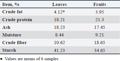 Fig. 1. The Calotropis procera The entire fresh plant of C. procera was oven-dried at 60°C and then ground to a coarse powder using a mechanical grinder using samples that were gathered from the Al Hasa Region of Saudi Arabia. Merck is the supplier of the extraction solvent, dichloromethane (DCM) analytical reagent grade, and ethanol grade (purity 99%). Silica gel 60 mesh, GF254 silica gel plate for thin layer chromatography (TLC) analysis, and Florisil (a U.S. Silica Company trademark) for column chromatography. For GC/MS analysis, a DB-5MS capillary column and 99.9999% pure helium will be utilized. Extraction methodLiquid maceration extractionThe fresh whole dried C. procera plant (500 g) was homogenized at room temperature with 2,000 ml of two different polarity solvents (ethanol and DCM) (Merck) in a rotary mixer set at 45°C and 200 rpm for 48 hours. The extracts were then filtered through filter paper Whatman No. 4, and all of the solvents were evaporated under a vacuum using a rotary evaporator to produce crude extracts that were stored at 30°C for analysis. GC/MS method of analysisPhytochemical profiling of C. procera was performed at the Central Laboratory, Clinical Science Department, College of Veterinary Medicine, King Faisal University, utilizing a Shimadzu (GCMS-QP2010) gas chromatography/mass spectrometry system (Shimadzu, Japan). Utra-high purity helium (He) gas, a grade of 99.9999 % was used as the mobile phase at a constant flow rate of 1.5 ml/minutes. The system was fitted with a DB-5MS capillary column (30 m, 0.25 µm film thickness). A 1 µl of the sample was introduced into the split/splitless injector operating in splitless mode at 260 °C. The interface temperature between the GC/MS units was 220°C. The temperature program was started at 80 °C, followed by 10°C/minutes up to 240°C, with the final temperature held for 20 minutes. Mass spectral data were collected in scan mode within the 50–550 µ range (El Sherif et al., 2020). Fractionation by TLCThin layer chromatography (TLC) silica gel 60 F254 (20 cm × 20 cm) 25 ct (Merek, Italy). The primary active ingredients of medicinal plants, such as alkaloids, cardiac glycosides, coumarins, flavonoids, saponins, and tannins, can be quickly investigated using TLC, a chromatographic technique with a layer thickness of 0.25 mm. According to Suresh kumar (2021), the TLC spot is measured to ascertain the amount of material present. For each dry extract, the spot volume applied to the chromatographic TLC plates was 5 μl or 300 μg. Starting with a nonpolar solvent (100%) and increasing the polarity by combining ethyl acetate to attain the optimal separation (70:30) hexane: ethyl acetate, TLC is carried out in the following solvent systems. The spots were first examined under UV 254 nm and UV 365 nm light without any chemical treatment. After that, the plates were heated to 110°C for 15 minutes to produce a pink spot for chemical organic compounds, and the plates were submerged in a freshly made mixture of vanillin (3 g), 50 ml of ethanol, and 0.5 ml of sulfuric acid. Proximate composition, phytochemical analysis, and TLCThe contents of ash, moisture, crude protein (calculated as nitrogen × 6.25), crude fat, crude fiber, and starch were analyzed using a FOSS, FoodScan near-infrared (NIR) spectrophotometer, employing the FOSS Artificial Neural Network Calibration Model and its associated database. The analyses were according to AOAC (2006). All proximate analyses were performed as percentages on a dry weight (dw) basis. Phytochemical analysisThe fresh dry plant of C. procera was analyzed for its phytochemical constituents at the Central Laboratory, Clinical Sciences Department, Faculty of Veterinary Medicine, King Faisal University. The extract was evaluated for the presence of terpenoids, alkaloids, flavonoids, tannins, phenols, and saponins with standard colorimetric methods described by Sofowora (1993) and Kennedy and Thorley (2000). ResultsThe proximate analysis for leaves and fruits indicated that both leaves and fruits of C. procera contain valuable nutrients such as crude protein which ranges from 18.21% to 21.3%, crude fat from 3.95 to 4.12, starch from 34.65% to 41.23%, and crude fiber from 18% to 18.65% approximately (Table 1). Table 1. Proximate composition (%) of (C. procera) leaves and fruits.