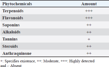 The qualitative phytochemical analysis of C. procera whole plant is presented in Table 2. The terpenoids and flavonoids are highly detectable, while steroids, alkaloids, and saponins and anthraquinones are moderately detectable. However, the tannins are low detectable. Table 2. Qualitative phytochemical analysis of the C. procera.