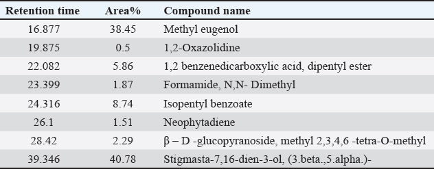 Fig. 2. GC/MS chromatogram for ethanol extracts of Calotropis procera. The primary active ingredients for the DCM extract of C. procera are Stigmasta-7,16-dien-3-ol 3 beta 5alpha (40.78%), methyl eugenol (38.45%), isopentyl benzoate (8.74%), 1,2 benzenedicarboxylic acid dipentyl ester (5.86), β-D glucopyranoside, 2,3,4,6 tetra-O-methyl (2.29%), N,N Dimethyl Formamide (1.87%), and Neophytadiene (1.51%), as reported in (Table 4, Fig. 3). TLC profile for extracts of C. procera exhibited that the presence of pink spots confirms the presence of flavonoids, steroids, and alkaloids in line with the results of phytochemical analysis (Fig. 4). Table 4. The constituents of DCM extract of Calotropis procera by GCMS.