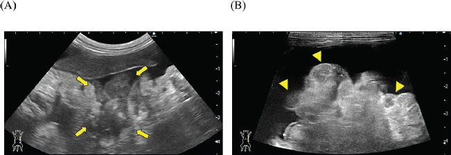 Fig. 2. Abdominal ultrasonography. Severe ascites were observed throughout the abdomen. (A) A hypoechoic irregular area (arrow) was observed in the left upper abdomen, which was considered to be an enlarged pancreas. (B) The peritoneum exhibited irregular thickening, with scattered hypoechoic nodular formations internally (arrowhead). Postmortem ExaminationsAfter obtaining the owner’s consent, a postmortem examination was performed on the day of death. The cat was submitted for autopsy, modified with cosmetic techniques. Sampling for histopathological examination was limited to the thoracic and peritoneal organs, including the thoracic trachea, lung, heart, spleen, esophagus, stomach, intestine, liver, pancreas, kidney, bladder, adrenal gland, coelomic lymph nodes, and coelomic serosa. The samples were fixed in 10% neutral-buffered formalin, routinely processed with paraffin, and finally embedded, sectioned, and stained with hematoxylin and eosin (HE) stain. Grimelius, Azan, periodic acid–Schiff, and immunohistochemical staining were performed to confirm tumor differentiation and fibrosis. The primary antibodies and antigen retrieval method are listed in Table 1. To prevent endogenous reactions, the deparaffinized sections were incubated with 0.5% hydrogen peroxide in methanol at 24°C for 20 minutes. After heat-induced antigen retrieval (citrate buffer, pH 6.0 or 1 mM EDTA, pH 8.0) by heating to 120℃ for 10 minutes, sections were incubated in Tris-buffered saline containing 5% skim milk at room temperature for 20 minutes to prevent non-specific reactions. Sections were incubated overnight at 4°C with primary antibodies, reacted with the secondary antibody Histofine MAX-PO MULTI (Nichirei, Tokyo, Japan) for 60 minutes at room temperature, and visualized using ImmPACT DAB (Vector Laboratories, Burlingame, CA, USA). The accuracy of each primary antibody reaction and Grimelius stain was evaluated by the positive reaction of the internal positive controls in the case.