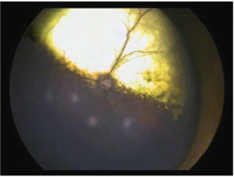 Fig. 5. An endoscopic photograph of the ocular fundus of an 18-month-old Pekingese diagnosed with glaucoma 3 weeks after globe replacement surgery illustrating normal fundus, with normal course and distribution of the retinal blood vessels, and optic nerve cupping. Several pathologic changes often develop secondary to the protrusion of the eye globe beyond the corresponding eyelid margins (Spaulding, 2008). These changes potentially compromise the vascular supply to the globe and subsequently reduce the vitality of the affected eye. Moreover, anterior displacement of the globe often causes overstretching of the optic nerve and potentially results in permanent vision loss (Miller, 2008). Relatively similar findings were recorded in the present study as there were two proptosed eyes with associated periorbital swelling that caused entrapment of the eyelids behind the globe conjunctiva, resulting in phthisis bulbi. Moreover, the rupture of the extraocular muscles was reported as a common complication resulting in long-term strabismus (Mandell and Holt, 2005). In the study reported here, the medial rectus muscle was ruptured in all investigated cases. Similar result was recorded in human and was explained by reflex interaction of upward and outward movement of the globe (Bell’s phenomenon) (MacEwen et al., 1992). The medial rectus muscle was difficult to be sutured which may be attributed to the anatomical position and shortness of the muscle. This may explain the relative lateral exotropia identified in all cases after GRS. Multiple extraocular muscle avulsions, corneoscleral rupture, and hyphema were previously considered as the most common negative prognostic indicators of proptosis in dogs and cats (Gilger et al., 1995; Spaulding, 2008). In the current study, all proptosed eyes with associated rupture of three ocular muscles ended up with phthisis bulbi. This could be related to the course and distribution of the branches of the ciliary artery in the anterior segment that enter the globe with the extraocular muscles (Miller, 2008). The clinically obvious miosis associated with proptosed eyes could be attributed to the unilateral oculomotor nuclear pathology or nerve contusion or compression. The previously reported favorable prognostic indicators for GRS in brachycephalic dogs with traumatic proptosis included the presence of vision on initial examination, positive direct or consensual pupillary light response, and lack of posterior segment abnormalities (Miller, 2008). On the contrary, the prognosis of globe proptosis in dogs or cats with associated loss of vision, hyphema, optic nerve damage, invisible pupil, facial bone fractures, or avulsions of ≥ 3 extraocular muscles is considered unfavorable for GRS (Gilger et al., 1995; Brando et al., 2005). These findings are relatively consistent with the results reported in the present study, as the prognosis was favorable when one or two muscles were ruptured in brachycephalic dog breeds and the pupillary light reflex was present at initial examination. Because there was no history of eye abnormality prior to trauma, the glaucoma diagnosed in the Pekingese dog could be related to the abnormally thick pectinate ligament identified in the endoscopic examination of the affected eye. The primary angle closure glaucoma caused by thick or abnormally developed pectinate ligament was previously described as a congenital disorder commonly seen in English and American Cocker Spaniels and Basset Hound (Gelatt and Brooks, 1999). However, the present study reported this condition in a Pekingese dog with traumatic proptosis. The mechanism of development of narrow and closed ICA in the American Cocker Spaniel was not completely clear, but a hypothesis was attributed the condition to the tight apposition of the iris that increased the pressure within the posterior chamber and in turn caused forward displacement of the basal iris (Gelatt and Mackay, 2004). Eventually, the basal iris narrows the ICA and the opening of the ciliary cleft. Apposition of the basal iris across the filtration angle potentially causes reversible angle closure (Gelatt and Mackay, 2004). Peripheral anterior synechiae usually develops with continued apposition of the basal iris, thereby closing the pathways of the aqueous outflow permanently (Källberg, 2003; Ofri, 2008). Moreover, the multiple small iris strands discerned via ocular endoscopy may have hindered the normal pathways of aqueous outflow and subsequently elevated the intraocular pressure of the affected eye (Källberg, 2003). ICA assessment is frequently performed by use of a goniolens which enables an investigator to have an overall circular view of the ICA (Abd-Elhamid et al., 2014). However, this previously reported technique does not allow the widening of specific areas for a detailed analysis (Guyomard et al., 2008; Abd-Elhamid et al., 2014). In addition, images must be produced by indirect ophthalmoscopy that requires extensive training and personal clinical expertise (Guyomard et al., 2008). The ICA has been identified in the present study with a wider view of the pectinate ligament at the trabeculum by use of endoscopy. These findings are, therefore, expected to facilitate glaucoma diagnosis, especially acute form with associated closed angle. In summary, unilateral traumatic proptosis has been diagnosed in 15 small-breed dogs admitted to our clinic during a 2-year study period, with Pekingese (~53%) and Griffon (~27%) dogs being the most affected breeds. Bruised, hyperemic, and swollen conjunctiva and periorbital tissue, as well as lateral globe retraction, cloudy cornea, and miosis were the common clinical findings identified at the initial presentation of the 15 patients. These clinical findings may have influenced the outcome of GRS. Thickening of the pectinate ligament of the ICA and optic nerve atrophy were the crucial endoscopic findings identified in the Pekingese dog presented with primary glaucoma. Expo