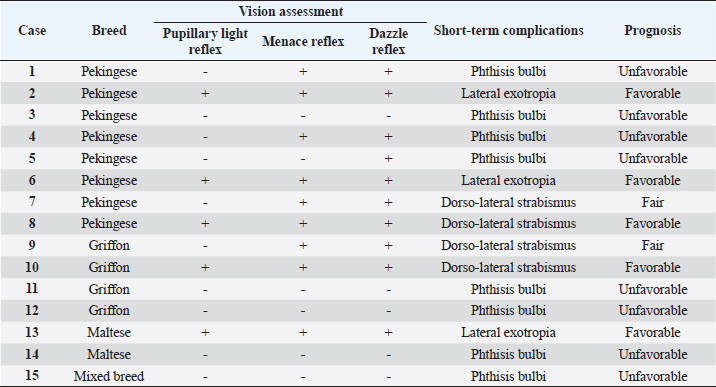 Open Vet. J.. 2019; 9(3): 222-229 doi: 10.4314/ovj.v9i3.6 Open Veterinary Journal, (2019), Vol. 9(3): 222–229 Case Report DOI: http://dx.doi.org/10.4314/ovj.v9i3.6 Clinical findings of traumatic proptosis in small-breed dogs and complications associated with globe replacement surgeryKhaled M. Ali and Ayman A. Mostafa*Department of Small Animal Surgery and Ophthalmology, Faculty of Veterinary Medicine, Cairo University, Cairo, Egypt *Corresponding Author: Ayman A. Mostafa. Department of Small Animal Surgery and Ophthalmology, Faculty of Veterinary Medicine, Cairo University, Giza 12211, Egypt. Email: aymostafa [at] cu.edu.eg Submitted: 14/01/2019 Accepted: 24/06/2019 Published: 04/08/2019 © 2019 Open Veterinary Journal AbstractBackground: Proptosis is a serious traumatic disease commonly affecting small breed dogs and possibly causing loss of vision, with globe replacement surgery (GRS) being essential in most of the cases after stabilizing the patient’s condition. Aim: To determine the common dog breeds and clinical findings associated with traumatic proptosis and demonstrate the short-term complications following GRS. Methods: The study was performed on 15 client-owned small-breed dogs presented with unilateral traumatic proptosis. Dogs were examined at initial presentation to determine the concurrent abnormalities associated with globe prolapse. The globe was replaced within the orbit and avulsed extraocular muscles were identified and sutured. Endoscopic examination of the ocular fundus was achieved 1 and 3 weeks after GRS in one Pekingese diagnosed with glaucoma. Complications following GRS were recorded. Results: Pekingese (53.3%) and Griffon (26.7%) were the most affected dogs with proptosis in Egypt. Bruised, hyperemic and swollen conjunctiva and periorbital tissue, lateral globe retraction, cloudy cornea, and miosis were common clinical findings associated with proptosis. Exposure keratitis, keratoconjunctivitis sicca, and exotropia were identified in all 15 patients at presentation. Complications following GRS included phthisis bulbi (53.3%), strabismus (26.7%), and lateral exotropia (20%). Intraocular pressure was reduced to 22 mmHg 3 weeks after GRS in the only patient diagnosed with glaucoma, and endoscopic evidence of optic nerve cupping was identified. Conclusion: Clinical findings associated with proptosis at initial presentation may have influenced the outcome of GRS. Favorable prognosis may be given to patients with relatively high potential for vision at initial presentation and ≤2 extraocular muscle avulsions. Immediate surgical intervention following the occurrence of proptosis should be advised to achieve favorable disease prognosis. Keywords: Clinical, Complications, Globe replacement, Proptosis, Small-breed dogs. IntroductionProptosis is an ophthalmic emergency condition characterized by partial or complete rostral displacement of the globe with respect to the corresponding orbit (Wheler et al., 2001). It is a serious traumatic disease commonly affecting small breed dogs, most likely brachycephalic dogs such as Shih Tzu, Pug, Pekingese, and Boston terrier (Mandel, 2000; Wheler et al., 2001). The disease most likely develops as a result of minimal lateral head trauma (Mandel, 2000; Wheler et al., 2001). The high incidence of proptosis in such dog breeds may be related to the prominent nature of their eye globes (Miller, 2008). Restraining small breed dogs by use of neck scruffs can occasionally cause a mild temporary proptosis (Mandel, 2000). In other dog breeds and cats, proptosis may develop secondary to a more violent blunt head trauma, such as an automobile accident. Proptosis commonly develops along with secondary contracture and entrapment of the corresponding eyelids behind the globe (Wheler et al., 2001; Crispin, 2005). These changes result in swollen periorbital tissues that potentially reduce the vitality of the globe and possibly cause loss of vision (Wheler et al., 2001; Crispin, 2005). Immediate surgical intervention via reduction of the globe is essential in most of the cases after stabilizing the patient’s condition (Mandell and Holt, 2005). Temporary multiple tarsorrhaphy sutures and routine ocular postoperative care are typically performed following reduction of the globe (Wheler et al., 2001). Enucleation should, however, be considered in the severely damaged globe (Wheler et al., 2001; Miller, 2008). Potential complications associated with proptosis included permanent strabismus, ulcerative keratitis, keratoconjunctivitis sicca, neuroretinal degeneration, and phthisis bulbus (Wheler et al., 2001; Mandell and Holt, 2005). However, the time interval between injury and initial surgical intervention is expected to influence the outcome of the treatment as well as the severity of associated complications (Mandell and Holt, 2005). The prognosis for patients with severely proptosed eyes and associated vision impairment is usually poor (Mandell, 2000). Furthermore, the prognosis for dogs with multiple extraocular muscle avulsions (≥ 3 muscles) is unfavorable and the globe should, therefore, be removed (Miller, 2008). On the contrary, presence of vision at initial presentation, absence of hyphema, minimal extraocular muscle damage, and normal fundus are the favorable prognostic indicators in most cases of traumatic proptosis (Gilger et al., 1995; Mandell and Holt, 2005; Miller, 2008). In partially proptosed eyes, the presence of direct and consensual pupillary light reflex is generally a good prognostic sign and yet its absence at initial examination cannot be considered poor prognostic indicator (Mandell and Holt, 2005). The purposes of the present study were to determine the common dog breeds affected with traumatic proptosis and to demonstrate the clinical presentation, vision assessment, endoscopic findings, and complications associated with such a disease. The aim of the study was also to evaluate the short-term complications after surgical