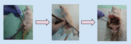 Fig. 2. Pre-operative stage (A) intraperitoneal anesthesia was administered to rats; (B) shaving the fur of the rat; (C) rats disinfected and ready for surgery.