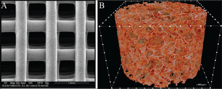Fig. 2. (A) OCF in the right lower canine tooth. (B) Close-up view of the OCF. (C) Oronasal defect on the day of surgery (day 0), showing fibrotic tissue deposition around the fistula in the mucosal epithelium. (D) Close-up view of the ORF. Preparation of the implantsWildcats were sedated with a combination of tiletamine-zolazepam (4 mg/kg IM, Zoletil®; Virbac) and medetomidine (15 µg/kg IM, Domitor®; Orion Pharma) (Simon et al., 2020). A high-precision silicone-based imprint material (HydroPutty™; Spident) was used to create a mold of the mandibular deformity (Perry, 2013). The impression was formed in Type IV dental stone (Durastone™; Kulzer) to produce a precise plaster replica. Scaffolds were fabricated using polyethylene glycol diacrylate (PEGDA) (Liu and Echeverry-Rendon, 2025); MW 700 Da; Polysciences Inc.) with <0.1% residual monomer, mixed with 0.5% lithium phenyl-2,4,6-trimethylbenzoylphosphinate (LAP; Tokyo Chemical Industry Co.) as a photoinitiator (Fig. 3). A digital light processing (DLP) bioprinter (LumiForge DLP; RegenMedTech) was used to print the scaffold at a resolution of 50 μm per layer (Perry and Echeverry-Rendón, 2025). The structure exhibited a lattice framework with a strand thickness of 0.45 mm and an overall height of 320 μm (Fig. 4). SEM confirmed an average pore size of 150 μm (optimal for osteoconduction) (Jones et al., 2023). Microcomputed tomography (µCT) (SkyScan 1173; Bruker) revealed a multi-layered structure with a 90° interlayer orientation (Yu et al., 2023). Sterilization was performed using hydrogen peroxide gas plasma at 45°C for 40 min (Sterrad® 100NX; Advanced Sterilization Products), validated with Attest™ 1295 Biological Indicators (3M) (Anderson et al., 2017).