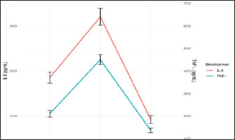 Fig. 13. Temporal dynamics of inflammatory biomarkers during healing of oronasal fistula. Serum concentrations of IL-6 (blue line, left axis) and TNF-α (orange line, right axis) were measured preoperatively (Pre-op), at POD 7, and at POD 30. Error bars represent the SEM (n=3 technical replicates). Asterisks indicate significant differences versus preoperatively (**p < 0.01, ***p < 0.001, two-way ANOVA with Bonferroni correction). The shaded area highlights the peak inflammatory phase that coincides with dysbiosis of the microbiome (Fig. 14).