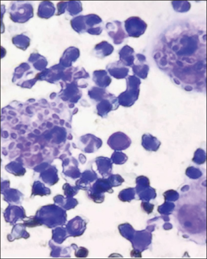 Fig. 2. Cytological examination using an impression smear at 100× magnification, and cornified epithelial cells, yeast capsules, and clusters of yeast capsules surrounding epithelial cells are observed. Table 2. Relationship between Sporothrix-infected cats and FeLV/FIV status and blood parasite infections.