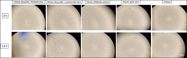 Fig. 2. Changes in turbidity over time at different nanoantibiotic dilutions against E. coli strain V19.11.3. (A) Chitosan, Polymer-Doxycycline+Oxytetracycline (Doxy-Oxy), Polymer-Doxycycline+Florfenicol (Doxy-Flor), and Polymer-Doxycycline+Oxytetracycline-silver (Doxy-Oxy-Ag); (+) Positive control; (−) Negative control. (B) Polymer-garlic (Nano-toi), Polymer-garlic-silver (Nano-Toi-Ag), and Polymer-Doxycycline+Florfenicol-silver (Doxy-Flor-Ag); (+) Positive control; (−) Negative control. (C) Polymer-Phyllanthus urinaria (Diep ha chau) and Polymer-Phyllanthus urinaria-silver (Diep ha chau -Ag); (+) Positive control, (−) Negative control. Note: For ease of interpretation, only two dilutions were selected for each nanoantibiotic: (i) the lowest dilution capable of inhibiting bacterial growth and (ii) the next higher dilution that did not inhibit bacterial growth (i.e., turbidity increased at 24 hours compared to 0 hours). A sample was considered to inhibit bacterial growth if the increase in turbidity was less than 1.5-fold. Table 2. Antibacterial activity of nano-antibiotic formulations against E. coli strains V19.11.3, S19.3.6, S19.3.14, S19.3.4, and S19.3.11.