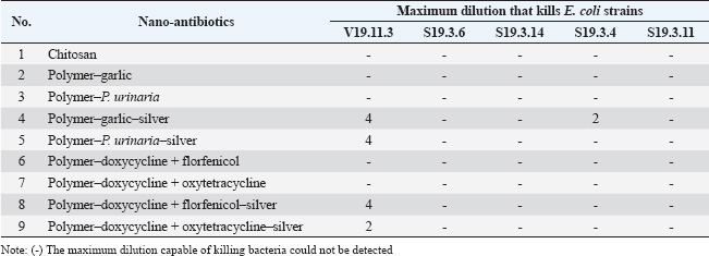 Table 3. Antibacterial activity of nano-antibiotics against E. coli strains V19.11.3, S19.3.6, S19.3.14, S19.3.4, and S19.3.11.