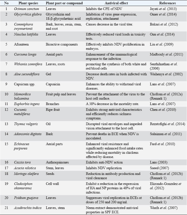 ABSTRACTMedicinal herbs have long been used for their ability to manage viral infections and other diseases. Plants are beneficial for treating several bacterial and viral infections in humans and animals. Plants play a crucial role in providing pharmacological and medicinal products due to their capacity to produce chemicals with antiviral properties via secondary metabolism. This could reduce the need for chemotherapy treatments in poultry. Recent research indicates that natural products have a significant promise as a source of novel antiviral agents. Additional ethnobotanical research and laboratory experiments are being conducted to identify plants with the potential to enhance avian influenza virus and Newcastle Disease management. This review sheds light on plants exhibiting antiviral effects against avian influenza virus and 21 Newcastle disease viruses. Keywords: Avian influenza virus, Newcastle disease virus, Management, Herbal plants. IntroductionViruses have a substantial mutation rate, resulting in the constant appearance of novel strains that are resistant to antiviral treatments. Thus, it is crucial to consistently investigate and create novel antiviral substances. In recent decades, there has been a growing interest in the quest for plant-derived pharmaceutical compounds that might effectively combat animal viruses with high fatality rates or that result in significant economic losses. The poultry business is a crucial agricultural sector that supplies food to approximately 7 billion people globally. The demand for chicken meat has been consistently rising and is projected to reach 131,607 thousand tons by 2026. The chicken business is affected by a range of pathogenic microorganisms, including viruses, bacteria, and protozoa. The most formidable diseases among them are viral infections that persist via genetic modifications, such as mutations, recombinations, or co-evolution with vaccinations (Yasmin et al., 2020). Although vaccinations have proven effective in managing several viral infections, some diseases may only be managed with the use of antiviral chemotherapy. The acceptance of antiviral medications has been gradual, mostly due to the toxicity associated with the previous generations of these agents. Unlike the progress made in the creation of antibiotics, efforts to create antiviral medications have encountered several challenges. Viruses rely only on cellular metabolic processes, which means that they have a restricted number of enzyme systems and building components that may be targeted by drugs. In addition, unlike a substance that inhibits the growth of bacteria, a potent antiviral medication must not only exhibit significant selectivity in its ability to combat viruses but also permanently hinder viral replication to prevent cell death caused by the viral infection and promote the resumption of normal cellular processes. A significant number of infectious viral illnesses continue to result in substantial fatality rates. Despite significant advancements in antiviral chemotherapy, there is a continuing need for antiviral medicines. The emergence of drug-resistant viruses during treatment is a possible obstacle to successful therapy. In addition, novel viral pathogens may be identified. Over a considerable period of time, phytochemicals have been recognized for their ability to suppress viruses. These antiviral chemicals may be obtained from sources, such as higher plants, which have been far less investigated than conventional sources for different reasons. The first antiviral medication with clinical efficacy was methylisatin-thiosemicarbazone (Methisazone), which showed effectiveness in treating dermatitis vaccinatum and preventing smallpox, particularly the smallpox virus. Methisazone, administered at a dosage of 25 mg/kg, exerted inhibitory effects against the variola virus. Subsequently, it was effectively used for treating dermatitis vaccinatum and as a preventive and therapeutic measure against smallpox. The proliferation of drug-resistant viruses in medical therapy is a significant challenge for achieving successful therapeutic outcomes. In addition, novel viral pathogens may also be discovered. Consequently, there is a significant need for readily available antiviral drugs that are affordable and have low adverse effects. Therefore, exploring traditional medicines as potential new antiviral agents is essential, given that several ancient remedies, which consist of various plant metabolites, have strong antiviral properties (Mukherjee, 2019). This review will discuss the antiviral effect of herbal plants against the most severe avian infections affecting the poultry industry caused by viruses, including the avian influenza virus (AIV) and Newcastle disease virus (NDV). The AIVThe Orthomyxoviridae family includes the AIV. The virus encodes at least 11 proteins through its negative, single-stranded, eight-segmented RNAs. Virus subtypes are defined by the surface hemagglutinin (HA) and neuraminidase (NA) proteins, which are in charge of virus attachment and release, respectively (Abdelwhab and Hafez, 2012). Based on its disease-causing potential in chickens, the virus is classified as either highly pathogenic AIV (HPAIV) or low pathogenic AIV. Numerous subtypes of AIV, such as H5, H7, and H9, co-circulate, rendering the vaccine useless. Hence, vaccination against several HA subtypes is essential. Immunological pressure, which accelerates the virus’s evolution rate, is another factor that reduces vaccination effectiveness (Yasmin et al., 2020). Table 1 summarizes the antiviral activity of some medicinal plants against AIV in birds. Eugenia jambolanaEugenia jambolana is a large perennial. Therapeutic compounds in tree bark and leaves may be used to treat chronic diarrhea, dysentery, sore throat, and bacterial and viral infections. The antiviral activity of crude leaf and bark extracts against HPAIV H5N1 was tested. The extracts completely suppressed the 