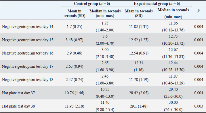 ABSTRACTBackground: The cause of autism spectrum disorder (ASD) is currently still unclear. Research on the etiology and biomolecular aspects of autism is needed to develop further prevention and therapy strategies. Animal models of autism are needed for further research. Aim: This study aimed to investigate the effect of valproic acid administration on motor coordination and sensory function in Mus musculus as an animal model of autism. Methods: This study used M. musculus that were ready to be mated and waited until they were pregnant. Randomization was carried out using the website random.org, and the participants were divided into two groups: the control and experimental groups. On embryo day 12.5, the control group was injected intraperitoneally with normal saline, and the experimental group was injected intraperitoneally with 600 mg/kg body weight of valproic acid. The offspring of the mice underwent autism symptom behavior test, motor coordination, and pain response. Results: There were significant differences in the negative geotropism test and hot plate test between the control and experimental groups (p < 0.05). The experimental group that was intraperitoneally injected with valproic acid takes longer to reorient on an inclined plane as part of motor coordination skills. The experimental group also provided a longer response time to heat stimuli on a hot plate, indicating an abnormal response to pain stimuli. Conclusion: Intraperitoneally injected M. musculus with valproic acid showed symptoms of autism, especially disorders in motor coordination and response to pain stimuli. Keywords: Animal model, Autism, Behavior, Mental health, Valproic acid. IntroductionAutism spectrum disorder (ASD) is a neurodevelopmental disorder characterized by impaired social communication and restricted and repetitive behaviors (Hirota and King, 2023). Autism is a spectrum disorder with various severities (Alpert, 2021). In its most severe forms, it can be completely disabling, requiring lifelong supportive care, often in a chronic health care institution. In milder forms, individuals with autism can lead normal, rich, and productive lives after learning coping strategies (Alpert, 2021). The incidence and prevalence of ASD are trending upwards worldwide. An estimated 1 in 100 children are diagnosed with ASD worldwide (Zeidan et al., 2022). The prevalence of ASD worldwide is 0.6% [95% confidence interval (CI): 0.4%–1%]. The prevalence of ASD in Asia, America, Europe, Africa, and Australia was 0.4% (95% CI: 0.1–1), 1% (95% CI: 0.8–1.1), 0.5% (95% CI: 0.2–1), 1% (95% CI: 0.3–3.1), and 1.7% (95% CI: 0.5–6.1), respectively (Salari et al., 2022). The cause of ASD remains unknown (Otaru and Lawrence, 2022). The etiology and pathophysiology of this disorder remain unclear (Li et al., 2021; Uddin et al., 2023; Jiao et al., 2024). Numerous environmental and genetic factors have been linked to the cause of ASD (Wong, 2022). Research in animal models is currently ongoing with the aim of modifying genetic risk factors and thereby helping to prevent autism in the future (Barik et al., 2023). Early identification of clear developmental differences may facilitate earlier interventions that may improve long-term quality of life (Cleary et al., 2023). The mechanisms influencing ASD development remain unclear (Uddin et al., 2023). Early interventions initiated before age 3 have a stronger positive impact than those initiated after age 5. Therefore, early diagnosis of ASD is very important. In addition to early diagnosis, a reliable set of ASD biomarkers is also useful in clinical practice, pathogenic processes, treatment and intervention outcomes assessment, and identifying physiologically homogeneous groups of patients with ASD (Liu et al., 2022). No single biomarker, neuroimaging finding, or genetic mutation is sufficient for an accurate diagnosis of ASD. In recent years, inflammation and oxidative stress have been implicated in ASD pathogenesis. The prevention aspect needs to be developed since in the womb (Usui et al., 2023). Oxidative stress is involved in the pathogenesis of ASD, either directly or through its interaction with inflammation and mitochondrial dysfunction. Oxidative stress biomarkers appear to have good potential to be used as diagnostic tools in the early diagnosis of ASD (Kuźniar-Pałka, 2025). Oxidative stress may be implicated in the pathophysiology of ASD (Chen et al., 2021). This study aimed to investigate the effect of valproic acid administration on motor coordination and sensory function. The results of this study are expected to provide opportunities for in vivo research on aspects of etiology and pathogenesis in animal models of autism, so that earlier diagnosis can be made in ASD and can be continued with evidence-based therapy in ASD. Materials and MethodsMaterialsThis study used valproic acid salt (Sigma-Aldrich, Burlington, Massachusetts, United States), an injection syringe, a mouse cage, a gastric tube for mice, hot plate test equipment, standardized feed, and a board for the negative geotropism test. The mice used were healthy Mus musculus from a certified institution, aged adults (8–10 weeks), and weighed between 25 and 40 g. MethodsThis study was a true experimental post-test only control group design (randomized control group) study on animal models. This study divided mice into the control (n=6) and experimental (n=6) groups. Mice were given 2 weeks of adaptation time in a cage with a wood-shaving floor. The light-dark cycle was set, the room temperature was 22 ± 2°C, and the room humidity was 65% ± 5%. Access to food and drink was free. The next procedure was to mate female mice with male mice by placing 1 male mouse and 2 female mice in one cage. Vaginal plug checks were performed every morning. Mice that had obtained vaginal plugs were calculated by fertilization on day 1 (Embryo 1) and at E12.5 were given intraperitoneal injection of normal saline in the 