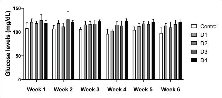 Evaluation of glucose levelsThe weekly assessment of blood glucose levels in rats treated with various doses of FeSO4 showed that both the duration of treatment (6 weeks) and the doses (D1, D2, D3, and D4) significantly affected this clinical marker (Fig. 1). Notably, a significant interaction was observed between time and dose (p=0.02), suggesting that the changes over time varied among the different study groups. In addition, the time factor had a highly significant effect (p < 0.001), and a significant main effect of dose was also found (p < 0.001).