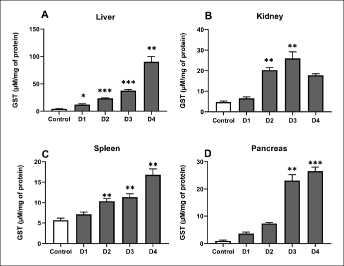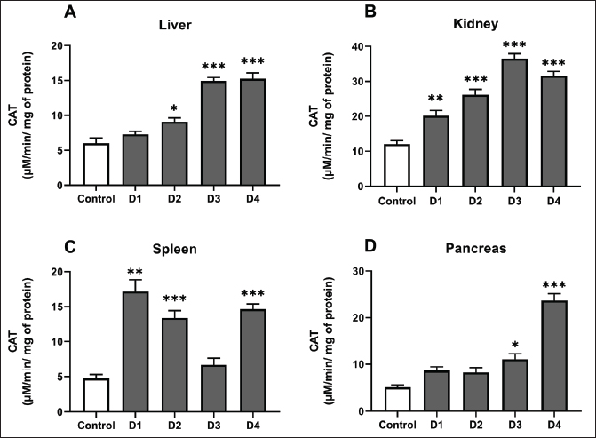 Fig. 3. CAT activity in the liver (A), kidneys (B), spleen (C) and pancreas (D) of control rats, and rats treated with different ferrous sulfate doses (12.5 mg/kg [D1], 25 mg/kg [D2], 50 mg/kg [D3] and 100 mg/kg [D4]) for 06 weeks. Values are expressed as the mean ± SEM. n=6 rats per group. Comparisons between control and treated rats were conducted using one-way ANOVA followed by Tukey HSD test (A–C) and Kruskal-Wallis test followed by Dunn’s multiple comparisons test (D). * p < 0.05, ** p < 0.01; *** p < 0.001 compared to the control rats. GST activityThe GST activity in the liver, kidney, pancreas, and spleen was evaluated following exposure to increasing doses of ferrous sulfate (Fig. 4). Overall, the GST activity increased in all examined organs, reflecting enhanced detoxification and antioxidant defense in response to oxidative stress. In the liver (Fig. 4A), GST activity displayed the most pronounced elevation in D2 (p < 0.001), D3 (p < 0.001), and D4 (p < 0.001), rising progressively with iron exposure and reaching a maximum of 90.26 ± 26.55 µmol/min/mg protein at 100 mg/kg, representing an increase of approximately (+78%, p < 0.001). A moderate but significant increase was observed in the kidney at (D2, p < 0.006) and (D3, p < 0.002) (Fig. 4B). In comparison to the control animals, a significant increase in enzymatic activity was observed in the spleen supernatants at doses of 25 mg/kg (D2, p=0.002), 50 mg/kg (D2, p=0.002), and 50 mg/kg (D4, p=0.002). However, no significant variation was observed at the 12.5 mg/kg dose (D1, p=0.38; Fig. 4C). Importantly, the results showed a significant increase in this enzymatic marker in the pancreas at doses of 50 mg/kg (D3, p=0.001) and 100 mg/kg (D4, p < 0.001) compared with the control rats (Fig. 4D).