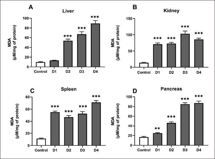 Fig. 5. MDA levels in the liver (A), kidney (B), spleen (C) and pancreas (D) of control rats and rats exposed to different ferrous sulfate doses (12.5 mg/kg [D1], 25 mg/kg [D2], 50 mg/kg [D3] and 100 mg/kg [D4]) for 06 weeks. Values are expressed as the mean ± SEM. n=6 rats per group. Comparisons between control and treated rats were conducted using Welch's ANOVA test followed by Games-Howell's multiple comparisons test. ** p < 0.01, *** p < 0.001 compared to the control rats. AChE activityAfter 6 weeks of treatment, AChE activity showed distinct variations across the studied organs, reflecting a dose-dependent influence of ferrous sulfate (Fig. 6). In the liver, AChE activity decreased significantly (−52%, p < 0.003) at the dose 12.5 mg/kg and significantly decreased (72%, p < 0.001) at 25 mg/kg. At 50 mg/kg (5.24 ± 0.97 µmol/min/mg, −18%), no significant difference (p= 0.80) was noted, whereas at 100 mg/kg (3.32 ± 0.70 µmol/min/mg, −48%), the decrease was again significant (p < 0.01) (Fig 6A). In the pancreas, a significant decline (p= 0.02) was recorded at 12.5 mg/kg (4.32 ± 0.48 µmol/min/mg, −35%), followed by a significant decrease (p < 0.001) at 25 mg/kg (1.98 ± 0.86 µmol/min/mg, −70%) and 50 mg/kg (2.66 ± 1.02 µmol/min/mg, −60%, p=0.001). The inhibition was more pronounced and highly significant (p < 0.001) at 100 mg/kg (1.50 ± 0.68 µmol/min/mg, −77%) compared with the control (6.66 ± 1.27 µmol/min/mg) (Fig. 6A). In the spleen, AChE activity increased significantly (p=0.01) at 25 mg/kg at 25 mg/kg (5.39 ± 1.41 µmol/min/mg, +147%) compared with the control (2.18 ± 0.89 µmol/min/mg). At 50 mg/kg (4.40 ± 1.06 µmol/min/mg, +102%), the increase remained significant (p=0.01), whereas at 100 mg/kg (6.83 ± 1.57 µmol/min/mg, +213%), the increase was highly significant (p=0.003), with no significant change at 12.5 mg/kg (p=0.25) compared with the control group (Fig. 6C).