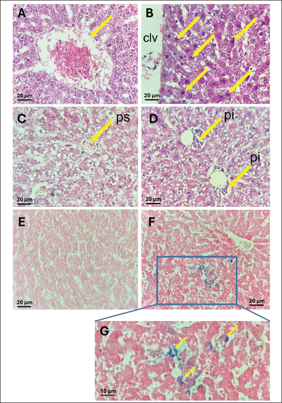 Fig. 7. Photomicrographs of the liver tissue (Magnification 40X/0.65). (A and C) Controls; (B and D) Hematoxylin and eosin staining for 100 mg/kg ferrous sulfate-treated group B: hepatocytes exhibiting eosinophilic cytoplasm with condensed nuclei (arrows) around the centrilobular vein (clv). D: Mild portal inflammation (pi) (5–15 mononuclear cells) observed in <25% of portal spaces (ps) (arrows) without fibrosis or extension into the lobules. extending into the lobules or causing fibrosis. Perls Prussian blue staining in the liver (E and F). E (control): absence of hemosiderin deposit. F: Blue deposit in Kupfer cells (score 1) in rats treated with 100 mg/kg ferrous sulfate. G (zoom): Deposit in Kupfer cells.