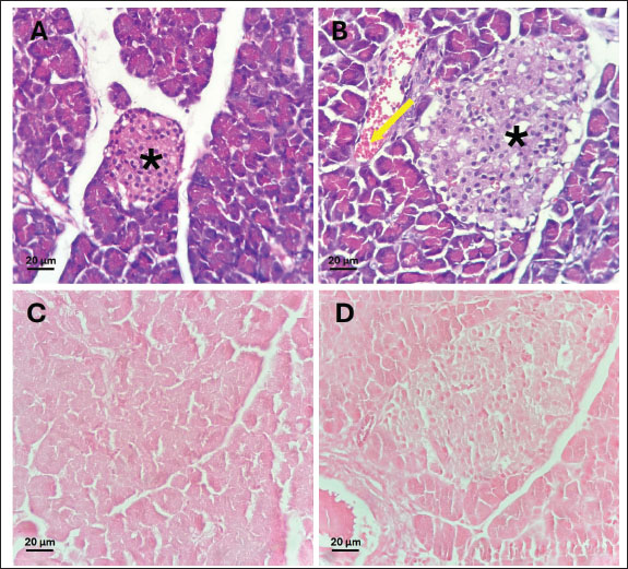 Fig. 8. Photomicrographs of HE stained pancreas tissue (Magnification 40X/0.65). (A) Control and (B) 100 mg/kg ferrous sulfate-treated group. B: Noteworthy congestion (arrows) is observed in the pancreas. C and D: Perls Prussian blue staining in the pancreas of rats. Absence of deposit (score 0) in C (control) and in D (100 mg/kg). *: Islets of Langerhans.