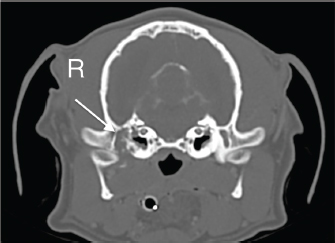 Fig. 2. Computer tomography transverse image of the head showing an extensive but circumscribed lytic lesion in the pars petrosa of the right temporal bone and a pathologic fracture of the right temporomandibular joint condyle with caudodorsal displacement of the distal fragment.