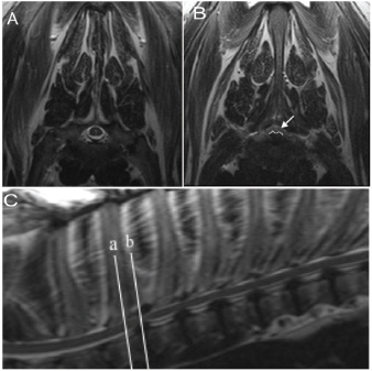 Fig. 1. (A) Transverse T2-weighted image corresponding to white line a. This is a normal cross section of the spine and spinal cord. (B) Transverse T2-weighted image corresponding to white line b. There is a ventral protrusion of the intervertebral disc, outlined in white, causing moderate spinal cord compression (white arrow). (C) Sagittal T2-weighted image with white reference lines at mid-body T2 and the T2–T3 intervertebral disc space. Multi-level intervertebral disc dehydration and mild ventral protrusion from T3-4 to T7-8 is also evident. After standard draping, the skin was covered with an additional antibiotic drape. Approach and exposure of the vertebrae was similar to a standard thoracolumbar hemilaminectomy described by Sharp and Wheeler (2005), performed by removing the muscle and its insertions/tendons from the vertebrae of interest as well as one to two vertebra cranial and caudal, followed by bony removal of the facet joint between vertebrae and ultimately removing the side of the vertebra along the area of spinal cord compression (typically creating an elongated rectangular defect in the cranial and caudal aspect of the vertebral bodies). By following the previously placed spinal needle, we minimized dissection of the surrounding muscle and its insertions solely to the vertebrae of interest. The subcutaneous tissues were retracted to reveal the thoracic fascia, which was incised in a paramedian fashion on the side of the lesion to avoid damage to the supraspinous ligament. Exposure of the vertebrae of interest was achieved by elevation of the transversospinalis and longissimus muscles from the spinous process, vertebral arch, and transverse and mamillary process, exposing the intervertebral foramen (Fig. 4B). Muscle retraction was maintained with Gelpi (Integra) retractors, and bleeding was controlled with bipolar electrocautery.