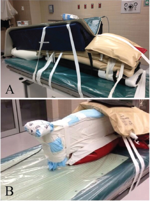 Fig. 2. (A) Surgical table prepared with padded trough and vacuum-bags for positioning of Dog 2, with the head facing to the right of the image. (B) Positioning of Cat 1 using a rectangular box covered with padding, with the head facing to the left of the image. A 3–5 mm pilot hole was created, preferentially in the lamina of the caudal vertebra of interest, using a pneumatic drill (Hall Surgairtome Two, West Coast Medical Equipment) with a round burr in order to identify the orientation of the spinal cord prior to continuing the hemilaminectomy (Fig. 4C). The hemilaminectomy could then be shaped on a case-by-case basis to provide ideal visualization of spinal cord compression, incorporating the pilot hole depending on its initial accuracy (Fig. 4D). This technique is further illustrated in Figures 5 and 6. There is a minimal associated risk, and the pilot hole allows the surgeon to tailor the hemilaminectomy window appropriately to maximize the removal of compressive material while minimizing trauma to the venous sinus, spinal cord, and ventral nerve root. This also guides the surgeon in removing a portion of the caudal aspect of the transverse process, which facilitates additional visualization and removal of compressive material. Drilling was continued to contour the hemilaminectomy window based on the extent of spinal cord compression, extending if needed over the lamina cranial and caudal relative to the intervertebral disc space. The periosteum was sharply incised and removed, along with regional epidural fat. The extradural spinal cord compression was removed from the vertebral canal. A 2-mm-thick piece of Gelfoam (Pfizer Incorporated) was placed over the laminectomy defect. The thoracic fascia, subcutaneous tissues, and skin were closed routinely.