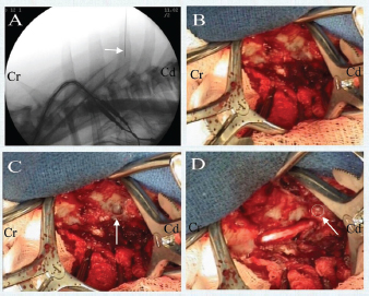 Fig. 4. View from the left side of midline with the head to the left of the picture. Cr indicates the cranial portion of the patient and the caudal portion of the patient is indicated by Cd. (A) Identification of surgical site using a spinal needle (arrow) and fluoroscopic guidance at T3 in Dog 1. (B) Dissection to expose T3 and T4 of Dog 1. (C) Pilot hole (arrow) created in caudal aspect of T4 of Dog 1. (D) Hemilaminectomy at T3–T4 of Dog 1. The pilot hole can be seen caudodorsal to the hemilaminectomy (outlined with a circle), illustrating the use of the pilot hole as a guide for the ultimate ideal placement of the hemilaminectomy.