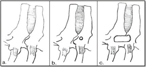 Fig. 6. Illustration of lateral thoracic spine (a) normal, (b) with pilot hole in caudal vertebra of interest, and (c) with hemilaminectomy performed. Postoperatively, each patient was evaluated by neurologic examination every morning of hospitalization. No neurologic deterioration (worsened ability to walk or move the hind limbs) was observed in any of the cases. Hospitalization from surgery to discharge ranged from 2 to 5 days, with the majority of patients leaving the hospital within 3 days after surgery. The longer hospitalization (5 days) occurred in Dog 2 and Cat 2, both paraplegic at the time of surgery. Daily post-operative evaluation during hospitalization demonstrated one case improved from non-ambulatory to ambulatory, two cases remained ambulatory with increased hind limb strength, and three cases were unchanged. Long-term follow-up (Table 1) revealed four cases were ambulatory with paraparesis and one case was normal. The case (Cat 2) that was initially paraplegic with absent sensation was lost to follow up. Our strategic positioning and approach were feasible in dogs and cats of varying size; body weight in the patients of this report ranged from 3.8 to 36.6 kg. With the described positioning and surgical approach, we were able to completely remove the compressive pathologic material, whether disc or tumor, in all but one patient. None of the cases experienced immediate post-operative deterioration, which has been a concern in many of the previous reports of cranial thoracic surgery in cats and dogs (Sumner and Simpson, 2007; Bottcher et al., 2008; Gaitero and Añor, 2009; Hearon et al., 2014). Hospitalization time was positively impacted by the lack of postoperative neurologic deterioration as well as lack of postoperative complications. Long-term follow-up revealed all dogs and two cats were ambulatory. Compared with the reported surgical techniques to address cranial thoracic compressive spinal lesions in dogs and cats, one of the main advantages of the hemilaminectomy technique reviewed here includes a less extensive and invasive approach to the vertebrae, thus preserving the supporting ligaments, muscles, and bones such as ribs to maintain vertebral column stability (Parker, 1973; Liptak et al., 1999; Jäderlund et al., 2002; Gaitero and Añor, 2009; Hearon et al., 2014). In addition, this approach may reduce complications such as pneumothorax and may improve postoperative recovery and time to discharge. The limitations of this study include its retrospective nature and the small number of cases. Both retrospective and additional prospective studies are therefore needed to confirm the efficacy and value of the surgical technique described here. Post-operative imaging would also be useful to demonstrate the extent of decompression and position of hemilaminectomy defect. The majority of animals were ambulatory prior to surgery, which may have made them better candidates for surgery regardless of technique, and lessened postoperative morbidity. AcknowledgmentsThe authors would like to thank Aude Castel, Andrea Tomas, and Tom Jukier for assistance with case collection. The authors would also like to thank John Ladner and Kurt Blackmon for their help in acquiring intraoperative images for this paper. No funding sources were used to support this study. Conflict of interestThe authors declare no conflict of interest related to this report. Authors contributionThe study was conceived by K.Y.B. and P.J.E. The surgical procedure described was performed by K.Y.B., P.J.E., N.J.O., and M.J.L. The article was written by KYB and PJE. The article was edited and content enhanced by N.J.O. and M.J.L. ReferencesBottcher, P., Flegel, T., Bottcher, I., Grevel, V. and Oechtering, G. 2008. Partial lateral corpectomy for ventral extradural thoracic spinal cord compression in a cat. J. Fel. Med. Surg. 10, 291–295. Gaitero, L. and Añor, S. 2009. Cranial thoracic disc protrusions in three German Shepherd dogs. Vet. J. 182, 349–351. Gaitero, L., Daniel, R., Nykamp, S. and Monteith, G. 2011. Cranial thoracic intervertebral disc disease in German shepherd dogs: a retrospective comparative MRI study [abstract]. J. Vet. Int. Med. 25, 730. Gilmore, D.R. 1983. Cranial thoracic intervertebral disk extrusion in a dog. J. Am. Vet. Med. Assoc. 182, 620–621. Hansen, H.J. 1952. A pathologic-anatomical study on disc degeneration in dog, with special reference to the so-called enchondrosis intervertebralis. Acta Orthop. Scand. Suppl. 11, 1–117. Hearon, K., Berg, J.M., Bonczynski, J.J., Suarez, C. and Bergman, P. 2014. Upper Thoracic Disc Disease (T1-T9) in Large-Breed Dogs. J. Am. Anim. Hosp. Assoc. 50, 105–111. Jäderlund, K.J., Hansson, K., Lindberg, R. and Narfstrom, K. 2002. T3-T4 disc herniation in a German shepherd dog. Vet. Rec. 151, 769–770. Jeffery, N.D. 1995. Handbook of small animal spinal surgery, 1st ed. Philadelphia, PA, pp: 9–23. Liptak, J.M., Watt, P.R., Thomson, M.J., Copeland, S.E. and Galloway, A.M. 1999. Hansen type I disk disease at T1-2 in a dachshund. Aust. Vet. J. 77, 156–159. Parker, A.J. 1973. Surgical approach to the cervicothoracic junction. J. Am. Anim. Hosp. Assoc. 9, 374–377. Reidarson, T.H., Metz, A.L. and Hardy, R.M. 1988. Thoracic vertebral osteochondroma in a cat. J. Am. Vet. Med. Assoc. 192, 1102–1104. Sharp, N. and Wheeler, S. 2005. Thoracolumbar disc disease. In Small animal spinal disorders: diagnosis and surgery, 2nd ed. Philadelphia, PA: Elsevier Mosby, pp: 121–159. Sumner, J.P. and Simpson, D.J. 2007. Surgical management of a recurrent spinal meningioma in a cat. Aust. Vet. J. 85, 276–280. Wilkens, B.E., Selcer, R., Adams, W.H. and Thomas, W.B. 1996. T9-T10 Intervertebral disc herniation in three dogs. Vet. Comp. Orthop. Traumatol. 9, 177–178. | ||