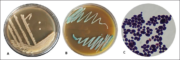 Evaluation of the antifungal efficacy of probiotic bacteria (Lactobacillus acidophilus) against C. albicans via agar well diffusionThe 50 isolated C. albicans isolates were tested for L. acidophilus susceptibility as an antifungal agent (Ji-Hee et al., 2022). Tubes containing 9 ml of brain heart infusion broth were prepared for the culturing of Lactobacillus bacteria. A tenfold serial dilution series (10-¹ to 10-7) was equipped, 1 μl of each dilution was injected into DeMan Rogosa and Sharpe agar and incubated on triplicate plates at 37ºC for 24 hours. The mean CFU count was calculated for suspensions with concentrations of 105, 106, and 107 cells per milliliter (CFU ml-¹). Lactobacillus was cultivated on MRS agar at 105, 106, and 107 CFU ml1 for 18–24 hours at 37°C with 5% CO`7, then transferred to MRS broth for BCB. After 24 hours, we centrifuged the culture for 10 minutes at 10,000 rpm to obtain the cell-free supernatant (CFS). After passing through a millipore filter (0.22 μm), Lactobacillus acidophilus CFS was adjusted to pH 7.0 ± 0.2 using 1M NaOH. Candida albicans were cultured in nutrient broth at 37°C for 18–24 hours. Petri dishes containing 20 ml of nutrient agar were filled with 100 μl of C. albicans broth culture using a spreading method. The plates were then left at room temperature for 1 hour, and holes were made in the agar using a cork borer. Fifty μl of Fresh MRSB aliquots used as control were added to one well, and the others were filled with neutralized CFS of Lactobacillus culture broth (105, 106, 107) . Agar plates were incubated at 37°C for 24 hours. Vernier callipers measured inhibitory zone diameters (mm) after incubation. The isolates were negative (-), positive (+), moderate (++), and strong (+++) (Ji-Hee et al., 2022). Susceptibility to some antifungal drugsCandida albicans isolates were subjected to the following antifungals: clotrimazole, ketoconazole, amphotericin B, itraconazole, and fluorocytosine using the standard disc diffusion method. This was done using the standard reference technique of the National Committee for Clinical Laboratory Standards (Mugale et al., 2015). The inhibition zone was measured, and the results were stabilized (Oliveira et al., 2016). ResultsMacroscopic and microscopical examinationThe samples collected from the oral cavity of yellow-vented bulbul, (50) swabs were investigated for C. albicans species. Of the 50 samples, 15(15/50) were positive for Candida albicans (30%). Based on the colony morphology on Sabouraud′s Dextrose Agar and Candida Chromogenic Agar (CCA), microscopically examined as shown in Figure 1.
