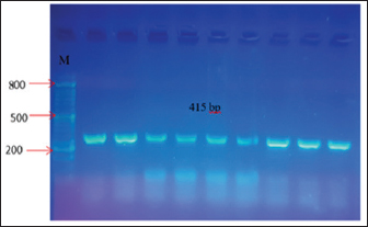 Fig. 2. PCR product analysis of pathogenic C. albicans by agarose gel electrophoresis. Lane M Marker ladder (800 bp), lane (1–9): 18SrRNA gene at 415 bp. Isolation and identification of L. acidophilusFive L. acidophilus out of 50 (10%) were isolated from apparently healthy sheep milk samples based on depending upon morphological characteristics as gram positive, catalase negative, and microscopic examination, as shown in (Fig. 3). As the 5 isolated were tested also tested by molecular technique PCR using 16S_LAuni showing (100%) giving positive results (Fig. 4).