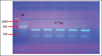 Fig. 4. The PCR product of the 16S_LAuni gene from Lactobacillus acidophilus is analysed using agarose electrophoresis. Lane 1: Molecular size marker (1,000 bp); Lanes 1–5: 16S _LAuni gene amplicons 277 bp. The antibiotic disc diffusion method was used to determine the antifungal profile of all (15) isolated C. albicans. The response of the isolates to clotrimazole isolates (10 µg), ketoconazole (10 µg), amphotericin B (10 µg), itraconazole (10 µg), and flucytosine (0.5 µg). was evaluated. The inhibition zones surrounding the disc were quantified and contrasted with breakpoints, following the manufacturers guidelines (DHN PAN Krakow, Poland). of the samples tested, 93.3% were sensitive to clotrimazole, 66.6% to ketoconazole, and 33.3% to itraconazole, but all were resistant to amphotericin B (100%), as detailed antifungal profile of C. albicans in Table 5 and illustrated in (Fig. 5).
