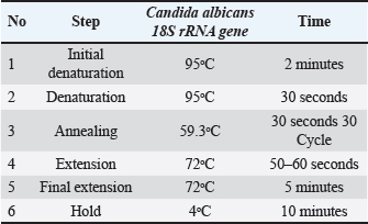 The master mix was prepared by mixing 3 μl of template DNA, 1 μl of forward primer, 1 μl of reverse primer (both at 10 pmol), and 20 μl of nuclease-free water according to the manufacturer instructions. The PCR equipment was set up for 30 cycles (Table 2). The PCR results were electrophoresed on an agarose gel for 1 hours at 100 V and visualized using a gel documentation system. Table 2. PCR program setting for Candida albicans.
